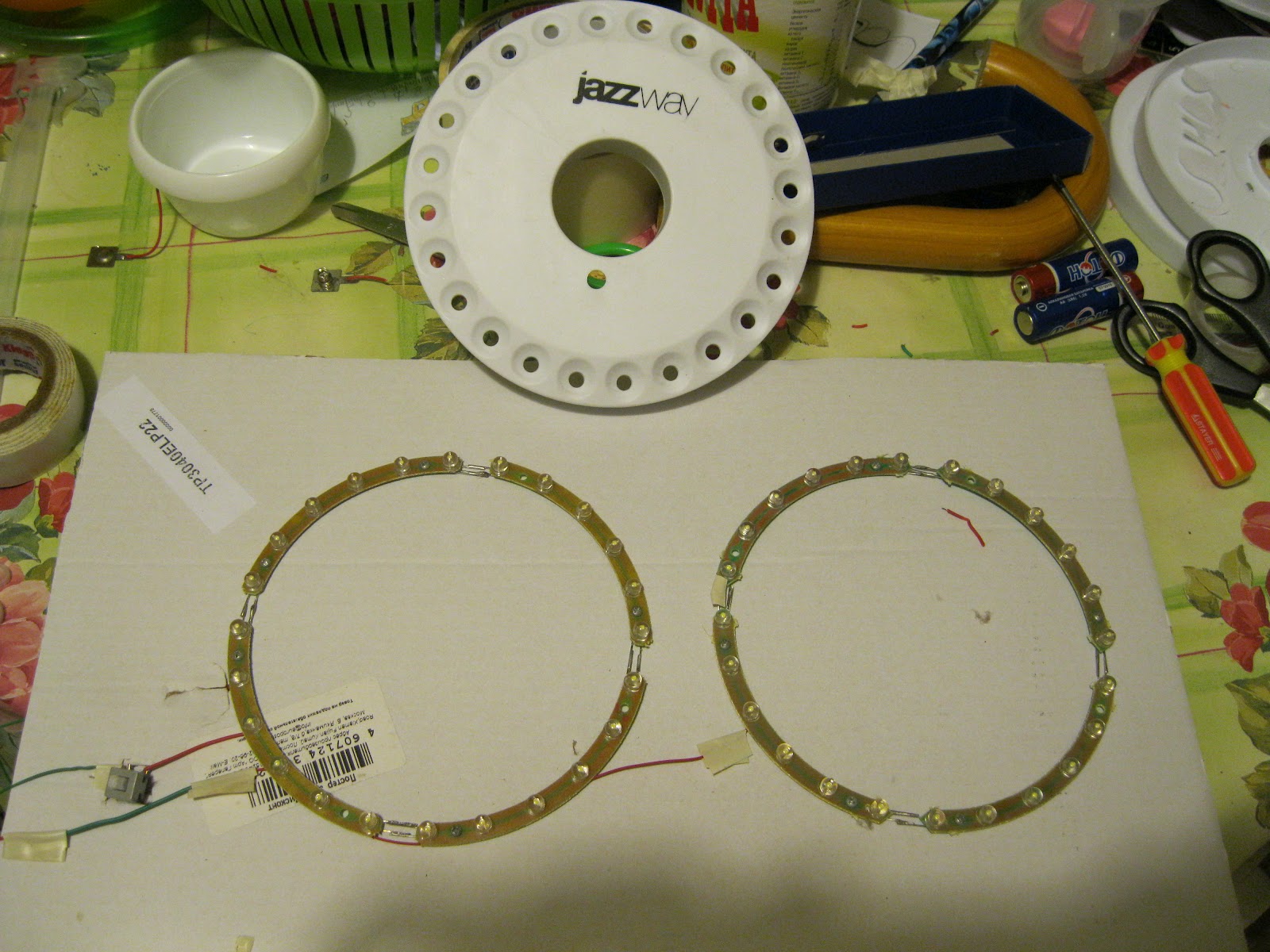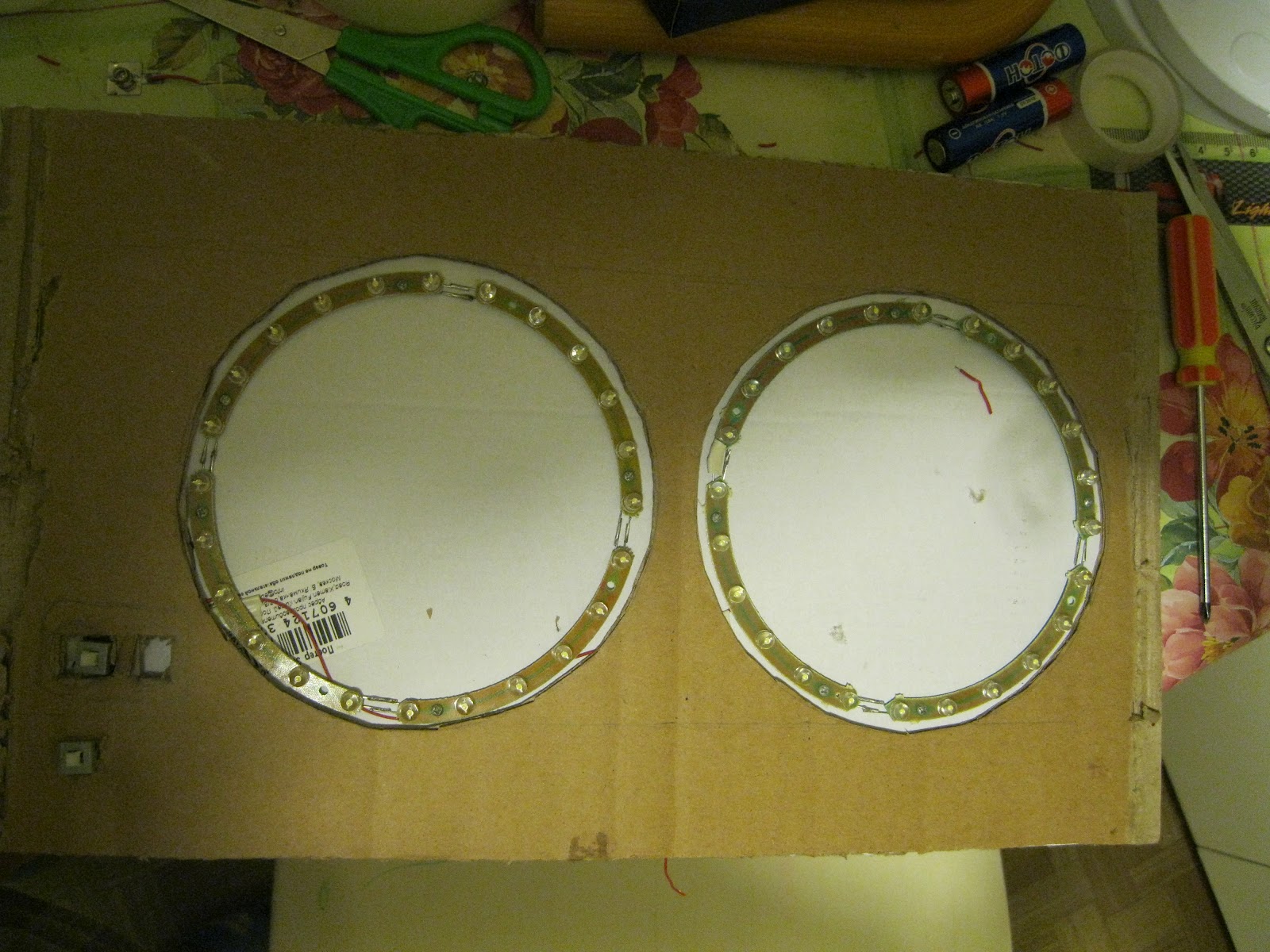Взяла два фонарика плоских со светодиодами на липучке. Раскрутила, вытащила кольца со светодиодами и прикрутила их на маленькие саморезы к толстому картону.
