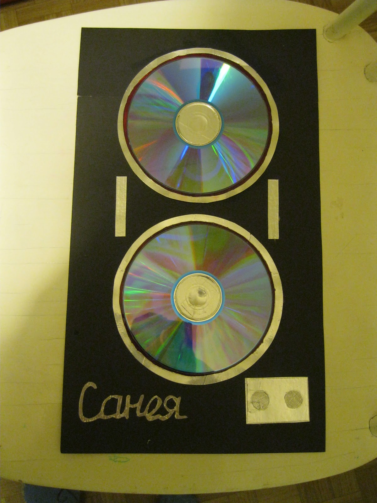 Вырезала дырочки на местах кнопок. С лицевой стороны приклеила на круги из пленки диски так, чтобы между картоном и диском осталась щелка. Дырочки для кнопок заклеила алюминевой лентой, выдавив на ней форму кнопок. Ну и еще небольшой декор алюминевой лентой.