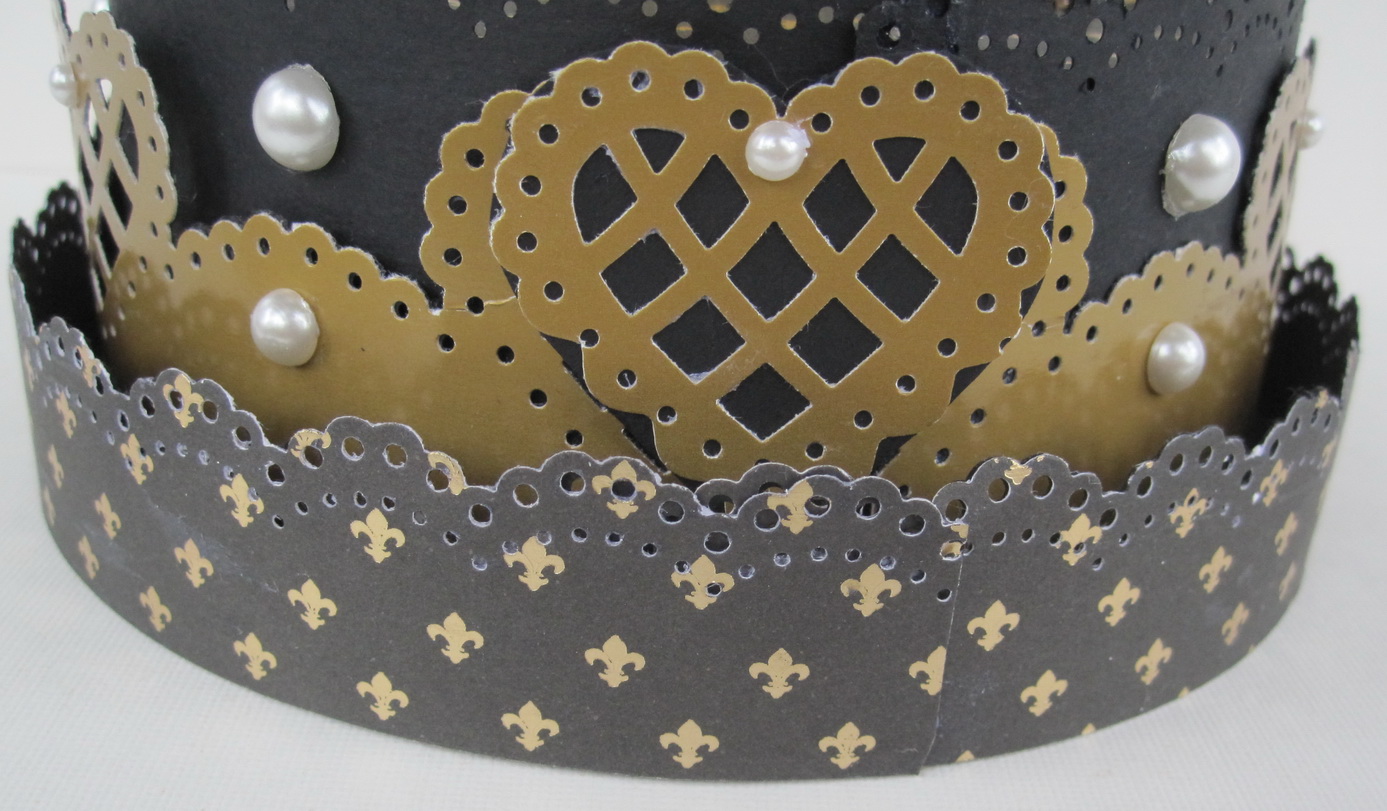 По материалам: бумага для пастели, золотой дизайнерский картон и гофрокартон, лист бумаги из набора DCWV Mariposa 30x30 см, чёрная бумага из альбома для рисования (для обратной стороны дырокольных элементов), круги для крышки шкатулки и основания купола вырезаны из упаковочного гофрокартона; кремовые половинки жемчужин Melissa Frances и Thailand, дыроколы MS Lattice heart, Doily Lace Edge Craft Punch, Monarch butterfly large, Rose leaf, круговой дырокол Fiskars.