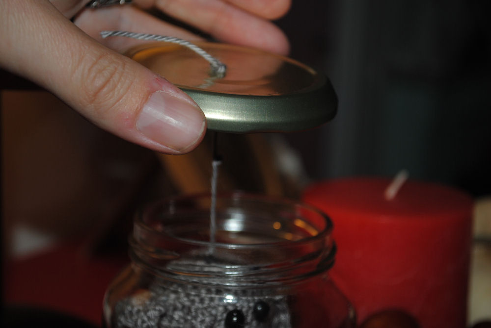 Сделать небольшое отверстие в крышке банки. Безопасный длинные серые нити к вашему паука. Возьмем другой стороны пряжи и вытяните ее через отверстие. Теперь сделайте узел, чтобы обеспечить паука. Убедитесь, что он висит и не касаясь дна кувшина.