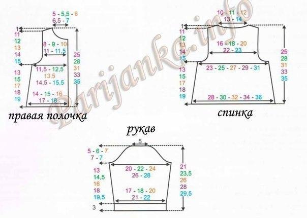 На высоте (13 см – 42 ряда) 15 см – 48 рядов (17 см – 54 ряда) 18 см – 58 рядов (19 см – 60 рядов) закрыть с каждого края для пройм рукавов в каждом 2-м ряду: (1 Х 3 п., 2 Х 2 п. и 3 Х 1 п.) 1 Х 3 п., 2 Х 2 п. и 3 Х 1 п. (1 Х 3 п., 1 Х 2 п. и 4 Х 1 п.) 1 Х 3 п., 2 Х 2 п. и 3 Х 1 п. (1 Х 3 п., 1 Х 2 п. и 3 Х 1 п.)