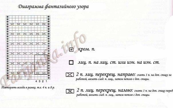 Продолжить спицами № 3,5 фантазийным узором по схеме, сделав с каждого края увеличение 1 Х 1 п. и начиная 1-й ряд с (1-й п.) кромочной и 1-й п. (1-й п.) кромочной и 1-й п. (кромочной и 1-й п.) петли схемы.