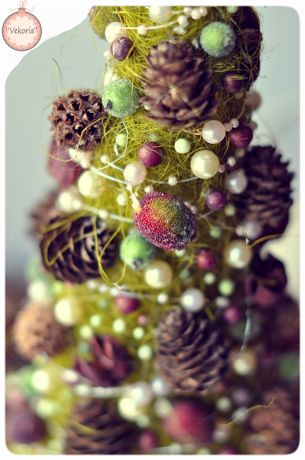Но ... на меня нахлынуло вдохновение,а точнее,я решила с утрировать ситуацию с бусами и увеличить их количество.И дополнила к ёлке бусы на леске,а так же добавила шарики из пенопласта и засахарённые ягоды и ёлочка получилась отличная!
