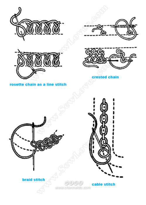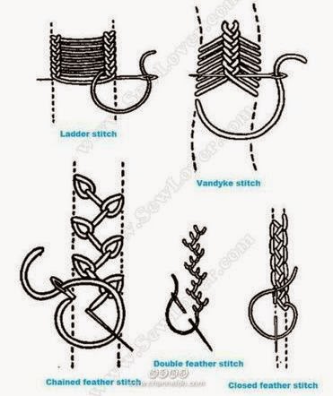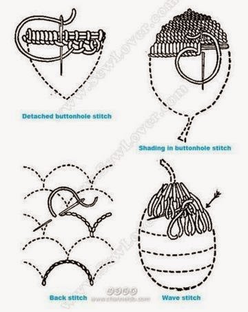 шов цепочка, французские узелки, стебельчатый шов, плоская гладь, сатин, перышко, елочка и шов вперед иголку.