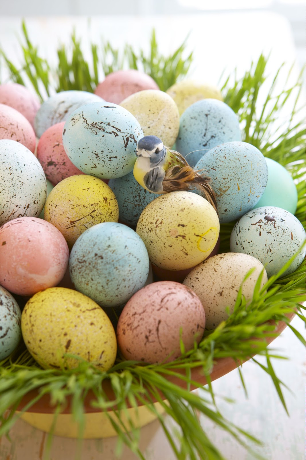 Ах, пятнистые украшенные яйца! Выглядят почти так же , как яйца найдены в птичье гнездо. Красить яйца использованием мягких пастельных тонах - Всего несколько минут в ванне. Дайте высохнуть.покрыть себя и рабочей Использование разбавленные sepai акриловой краской коричневого, взять старую зубную щетку и провести пальцем вдоль кисти брызги краски. Место в блюде терракоты с кольцом из ростков пшеницы по краям блюда.