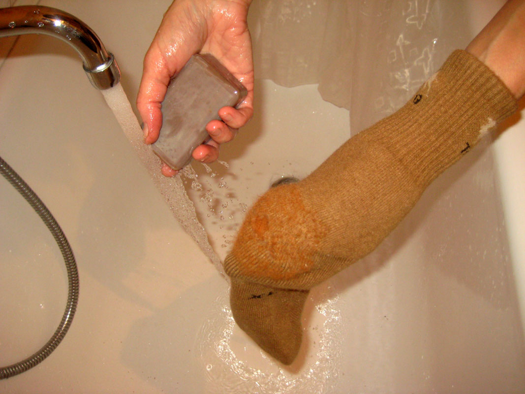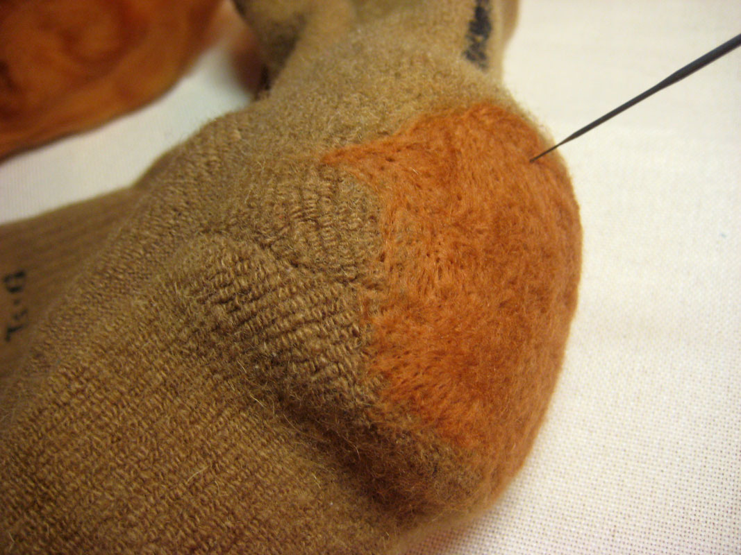 Носок вывернуть, подложить пол дырку губку, разровнять (на фото этого
