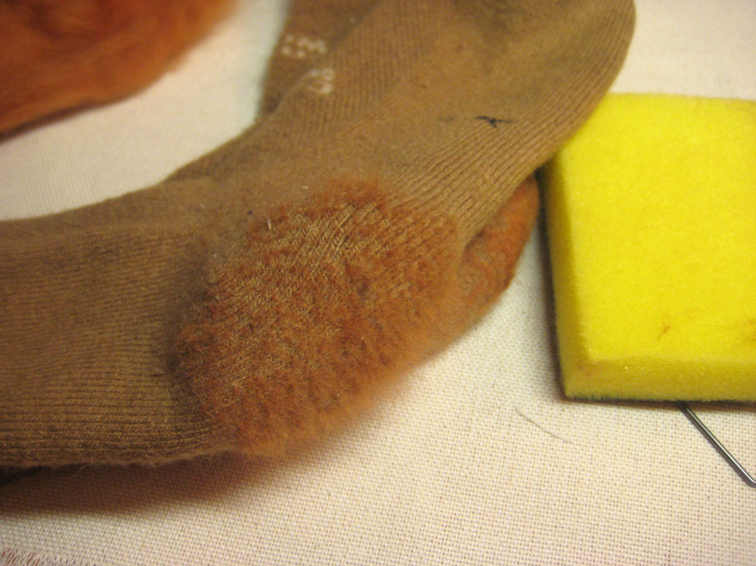 Итак, имеются носки, требующие штопки, шерсть и игла для валяния, поролоновая губка. Приступаем.