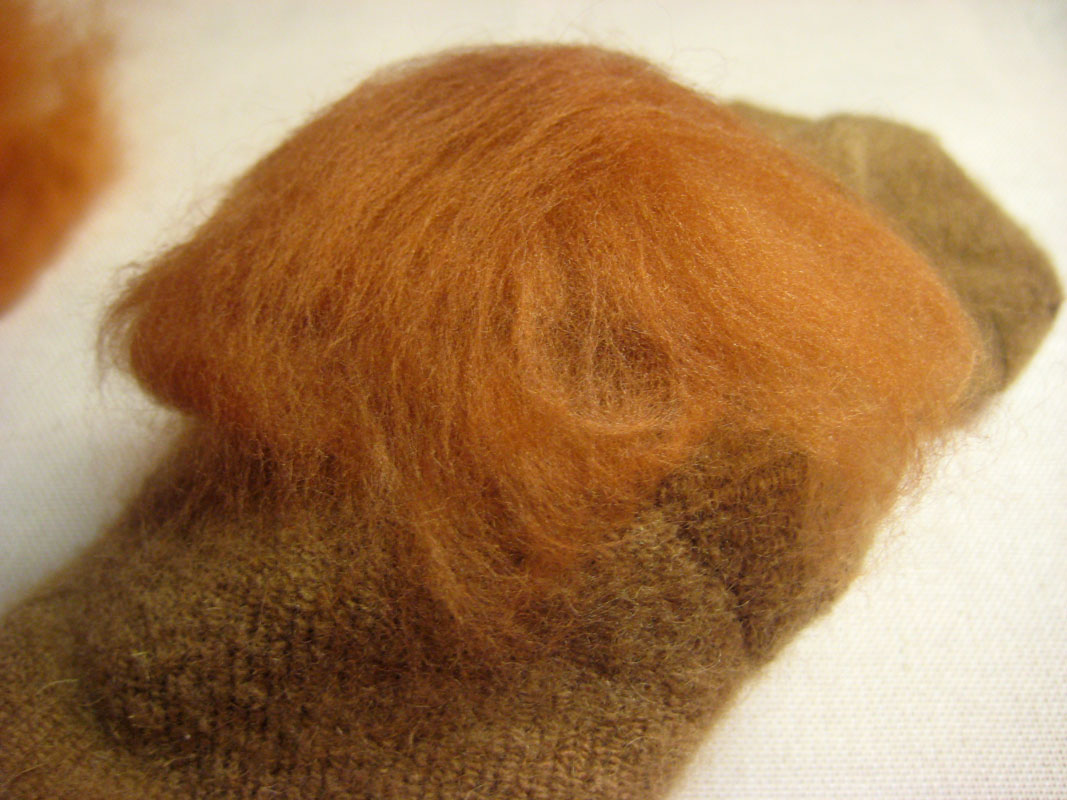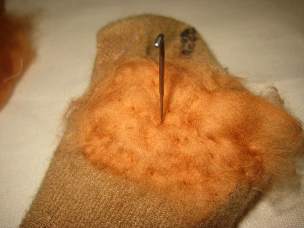 Отрываем небольшие пряди шерсти и укрываем ими дырку.