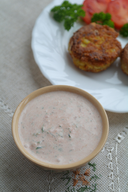 Соус готовится следующим образом. Помидор (1 шт.) ошпарить, очистить кожуру. Нарезать на части, положить в блендер. Положить к нему зелень петрушки, укропа и зеленого лука. Или только то, что имеется в наличии. Добавить соль, перец по вкусу. Всю массу пробить блендером.
