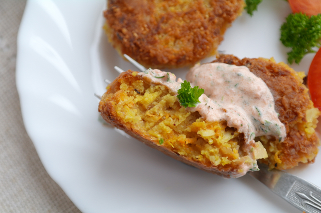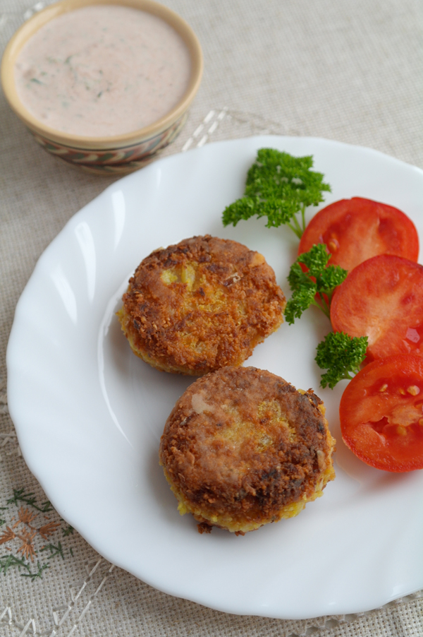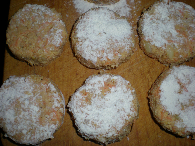 Сформировать руками из массы котлеты. Запанировать их в муке. Обжарить на оливковом масле до румяной корочки.