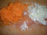 Лук и чеснок мелко нарезать. Морковь натереть на терке. Рекомендую лук спассеровать на оливковом масле. Я этого не сделала и сырой лук мне немого мешал.