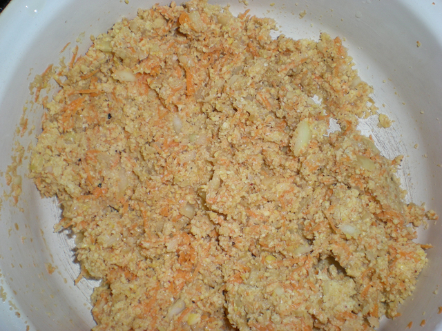 В нут добавить лук, чеснок, морковь, соевый соус, муку, соль. Перец, мускатный орех, сахар. Всю массу хорошо перемешать.