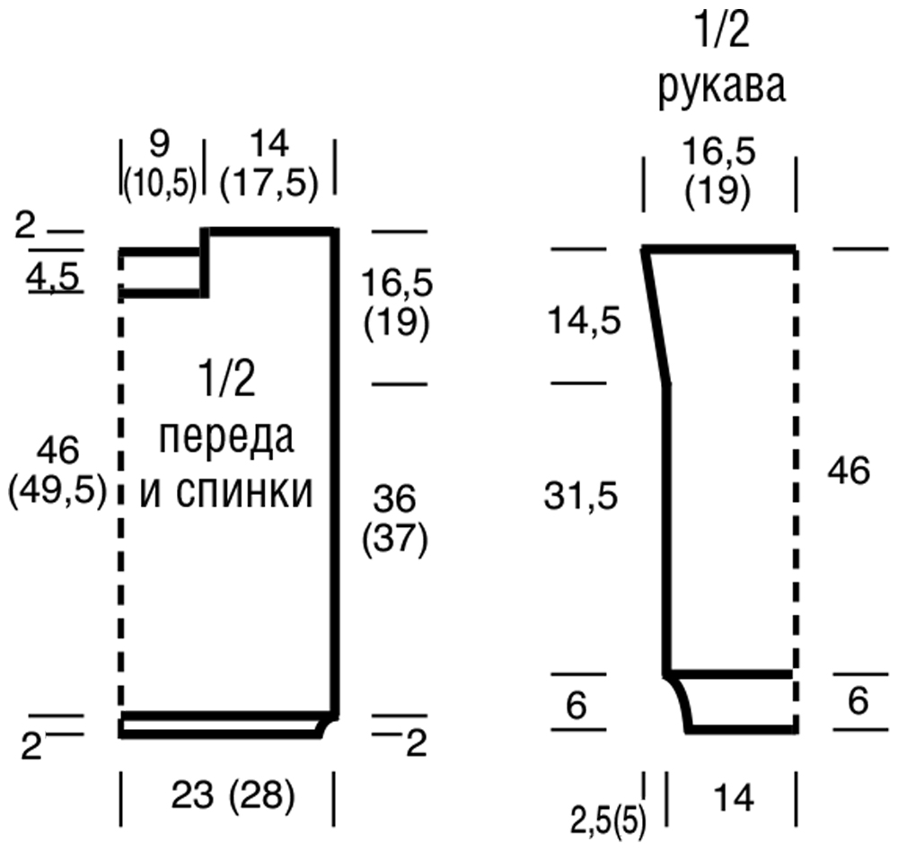 Вязать, как спинку, но для более глубокой горловины средние 41 (48) п. закрыть через 46 cм = 140 р. (49, 5 cм = 150 р.) от нижней планки и обе стороны закончить раздельно.