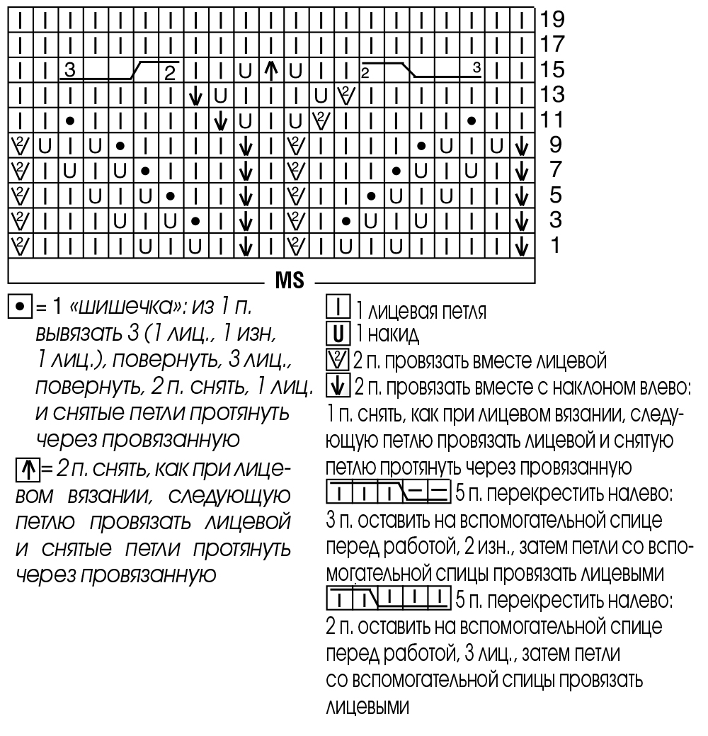 Количество петель кратно 21 + 2 кром. Вязать по приведенной схеме. На схеме даны только лицевые ряды, в изнаночных рядах петли, включая петли «шишечек», и накиды провязывать изнаночными. В ширину начинать с кром., постоянно повторять раппорт, заканчивать кром. В высоту повторять с 1-го по 20-й ряд.