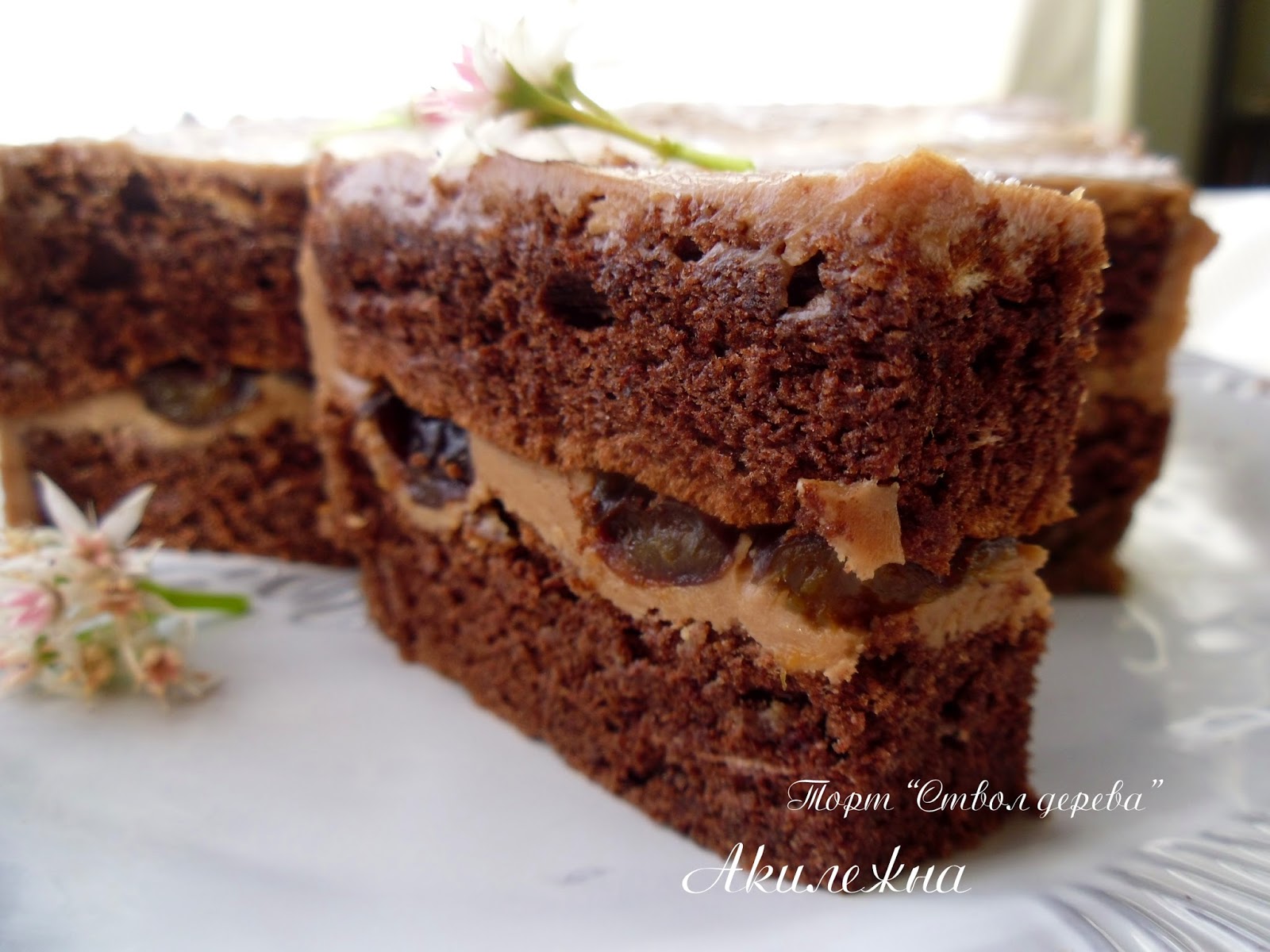 Я от себя еще добавила нарезанный на куски чернослив и выложила его между коржами сверху на крем.