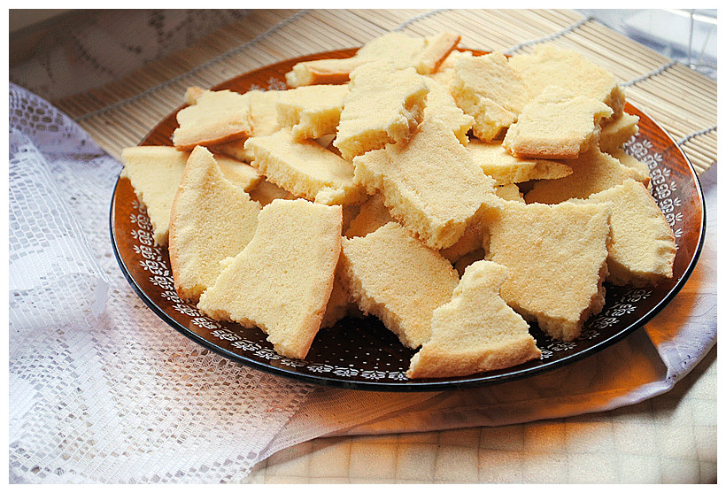 Белки отделить от желтков. Большую часть сахара всыпать в белки, осальное - в желтки. Муку смешать с крахмалом и просеять. Взбить белки до пышной устойчивой пены, а желтки до светлой массы. Выложить желтки на белки и осторожно премешать. Всыпать муку и перемешать до однородной массы без комочков. Выпекать на листе бумаги для выпечки, распределив тесто тонким слоем, при температуре 180гр. Остудить ,разорвать на кусочки и оставить высыхать .