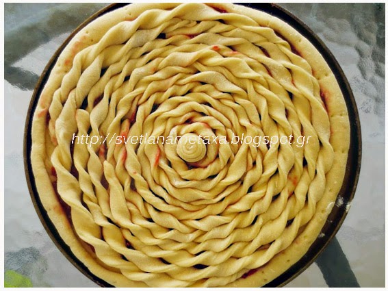 6. Выкладываем спиральки на начинку, начиная от центра по кругу, заполняя ими всю поверхность пирога.