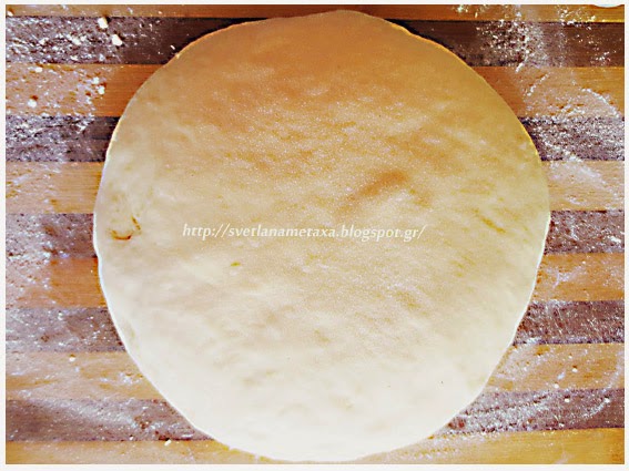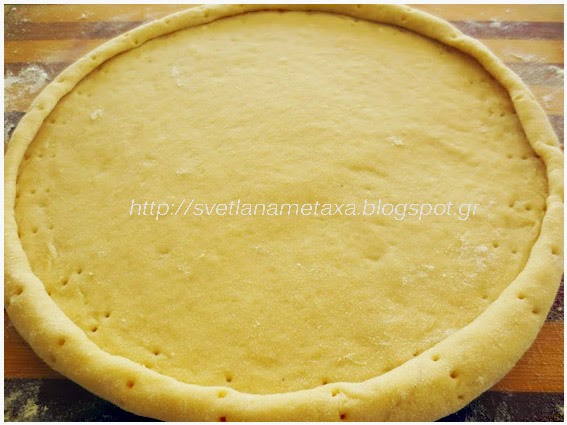 3.Готовое тесто делим на 2 части. Из одной части раскатать круглую лепешку. Круглую форму ( 25 см) застелить пергаментной бумагой и положить нижнюю лепешку. Края лепешки завернуть во внутрь, формируя бортик