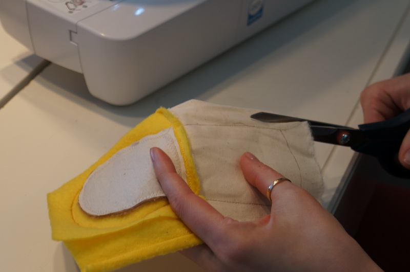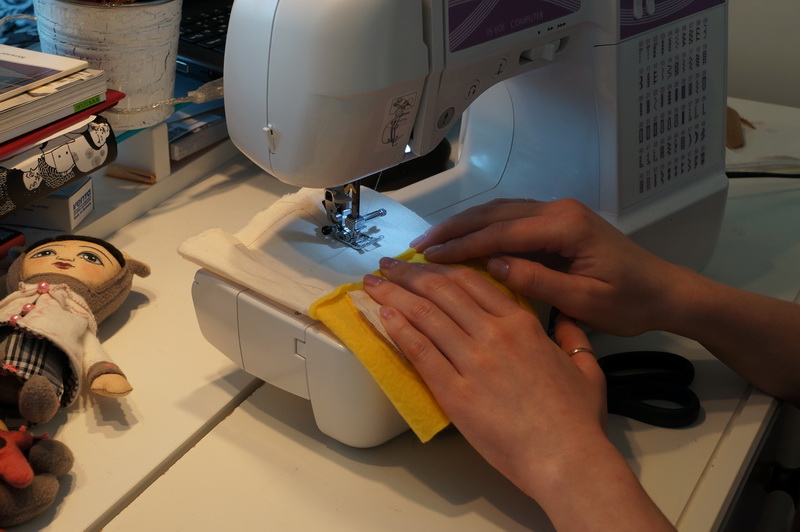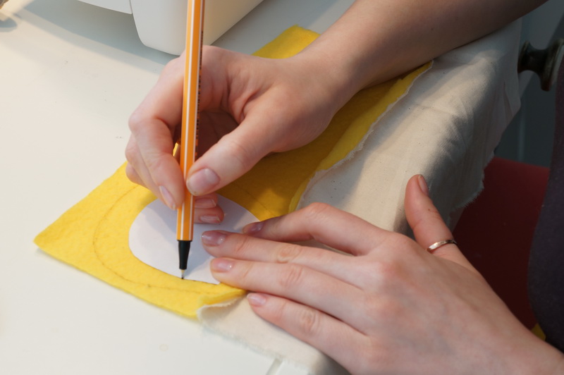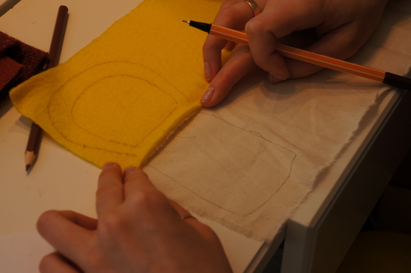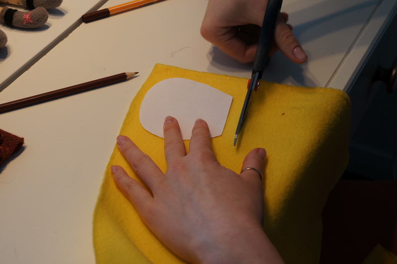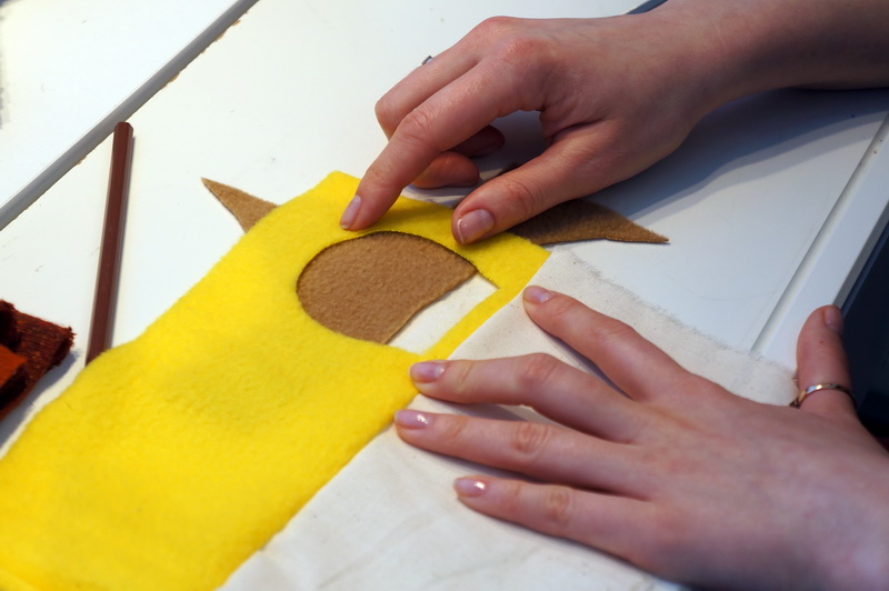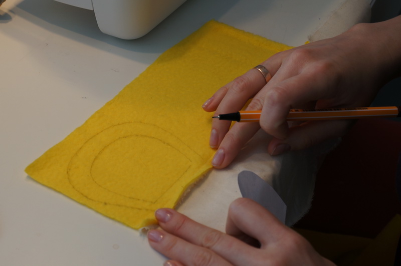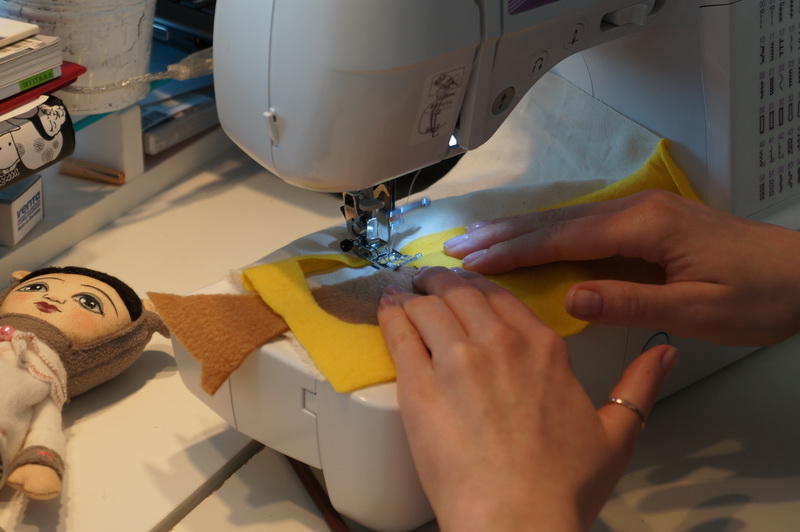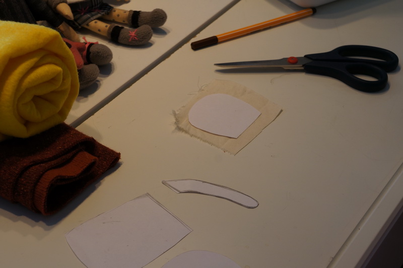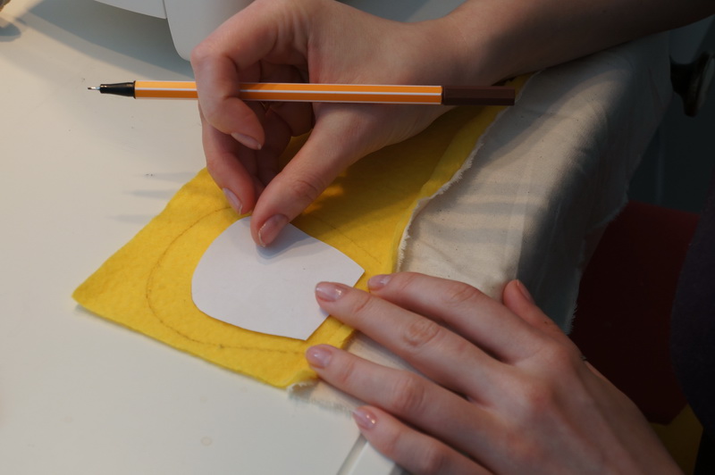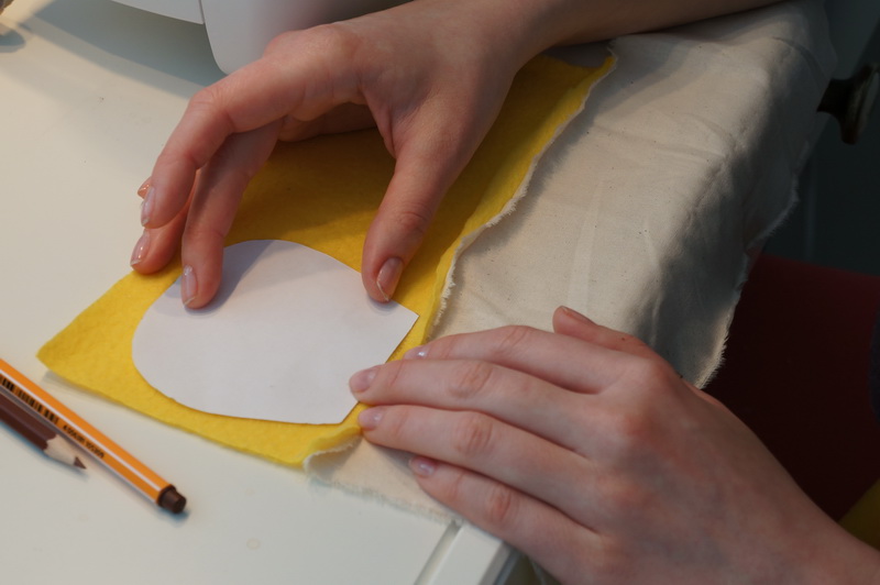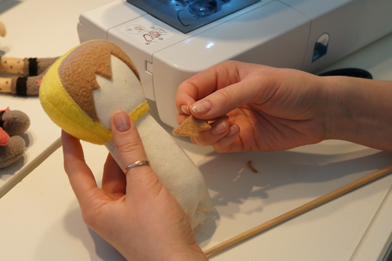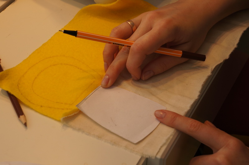Настала очередь личика, а вот тут вы можете пофантазировать. Выкройку можно расположить вплотную ко шву, и тогда цветная часть станет волосами, можно приподнять, расположив в центре основной выкройки и эта часть будет шапочкой.