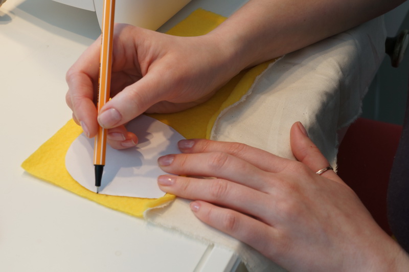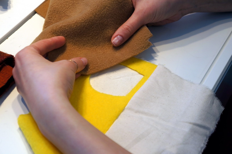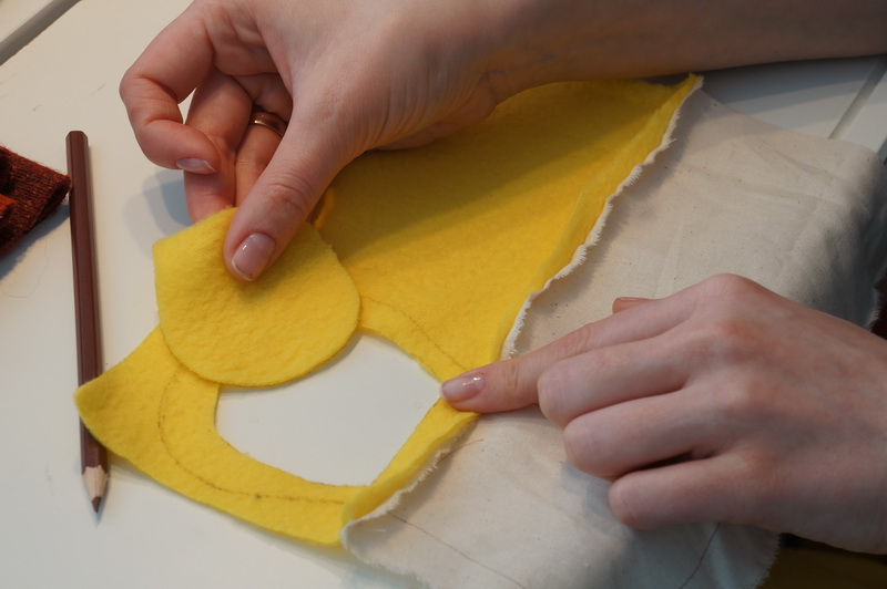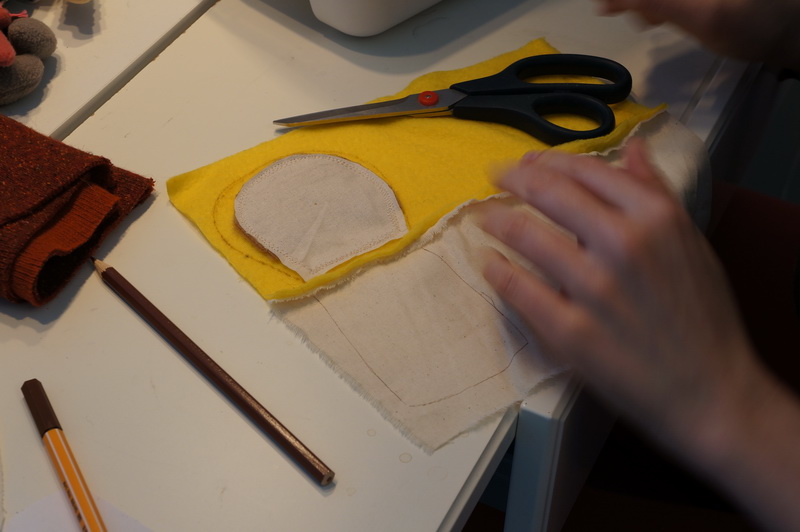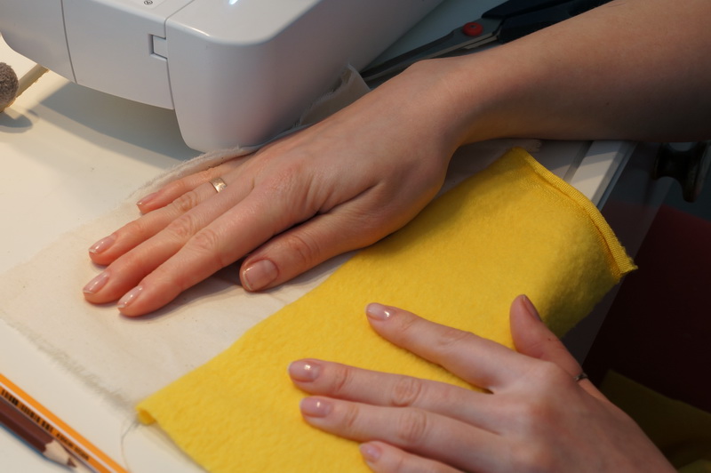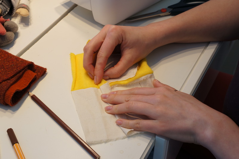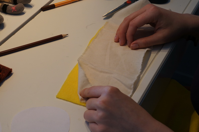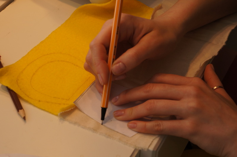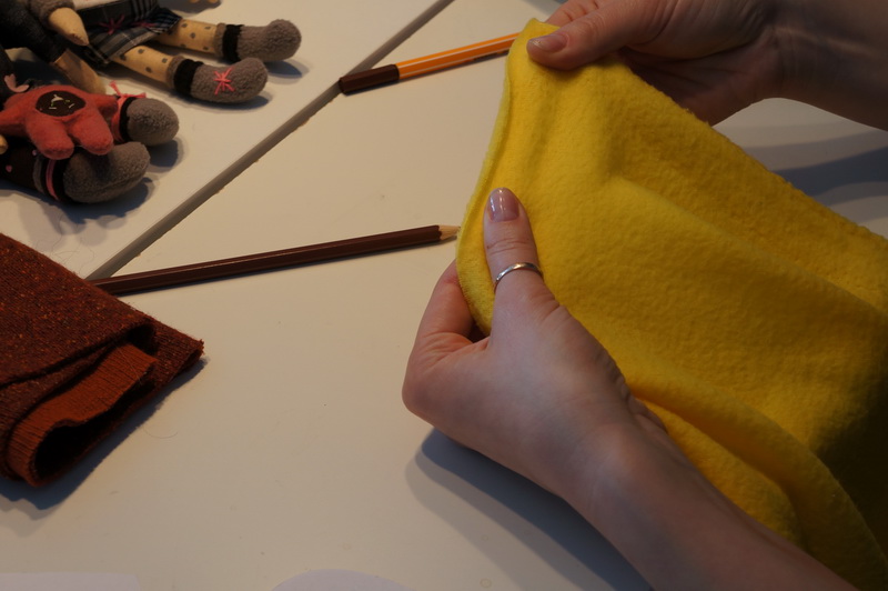 Подбираем направление ткани для основной головы. Я выбрала желтую. У меня будет весенняя девочка. Если вы хотите вытянутую в стороны голову, то выкройки будут распологаться вдоль тянущейся стороны, если вытянутую вверх, то вдоль не тянущейся стороны.