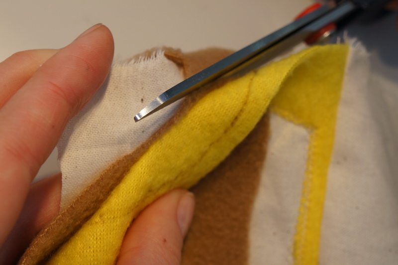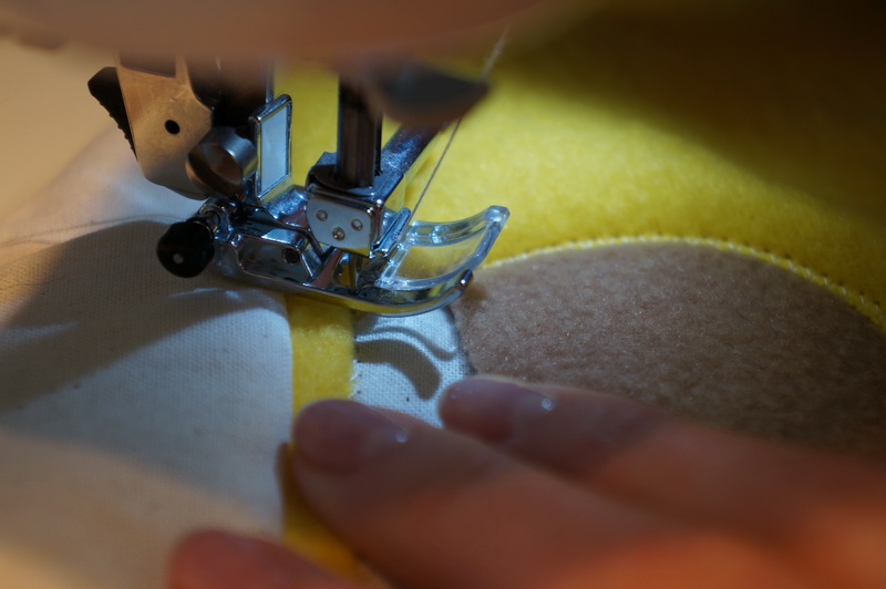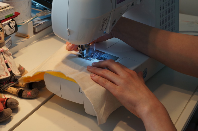 Строчку ведем по внешней стороне светлыми нитками или нитками в тон.