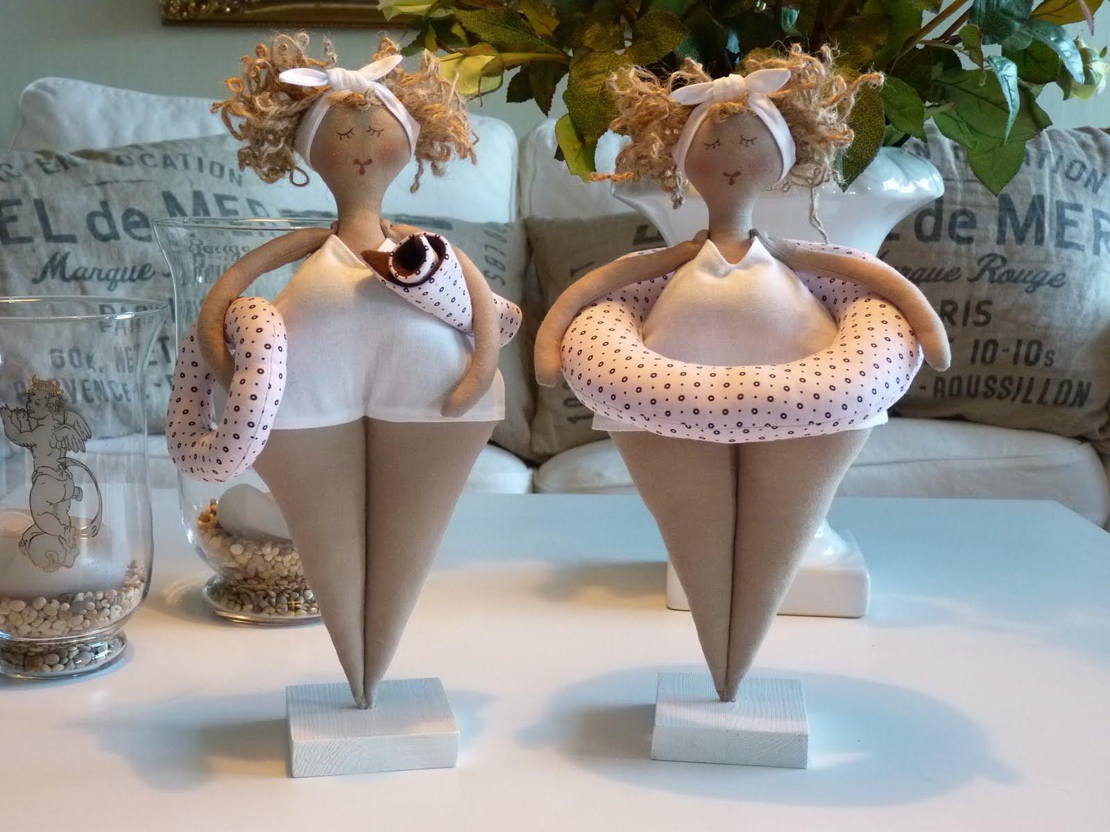 Kan visa några Matildor som jag sydde när det fortfarande var snö ute,och då kändes det inte riktigt rätt att sätta ut dem.Men nu har det nästan varit sommarvärme här i 2 dagar så man blir nästan lika badsugen som dessa två.