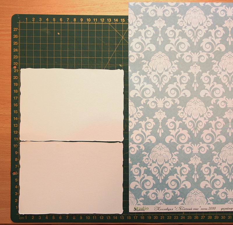 Раскладываем прямоугольные заготовки в виде открытого чемоданчика, измеряем размер внутреннего прямоугольника из скрапбумаги - 20,5*14,5см.