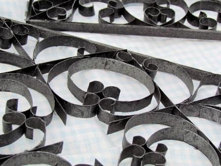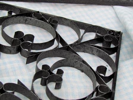 С помощью этих квадратов, я начал, разделив его на четыре равные части, а затем создание той же схеме в каждой части. Я просто создал, как я пошел и использовать конце кисти делать какие-либо завитков необходимости.Как только они были завершены и сухой, я затем спрей рисовал их краской металл-вид. Если вы лично и близко и даже дотрагиваться до них, они выглядят совершенно как металл. Но не стоить почти цене.