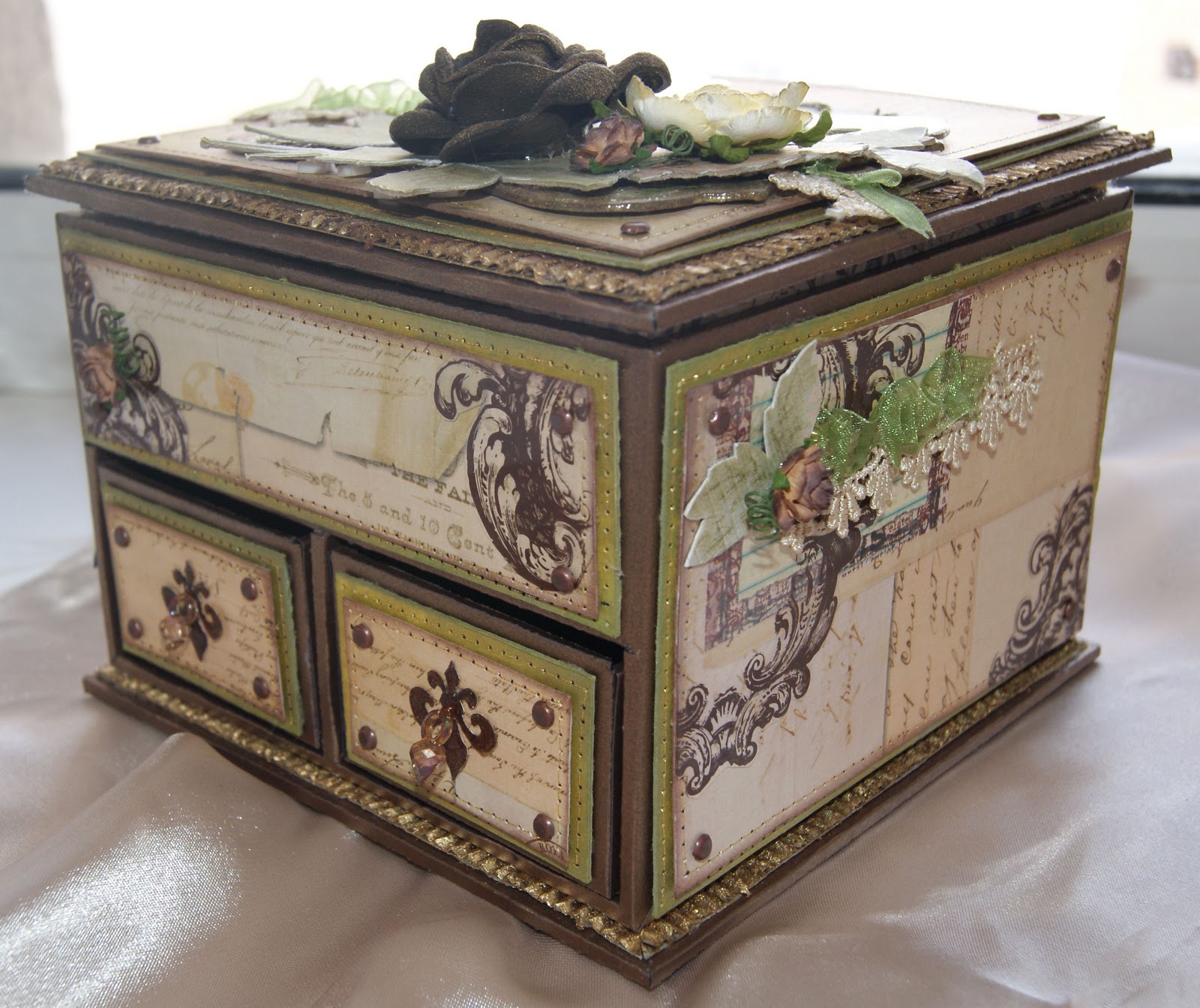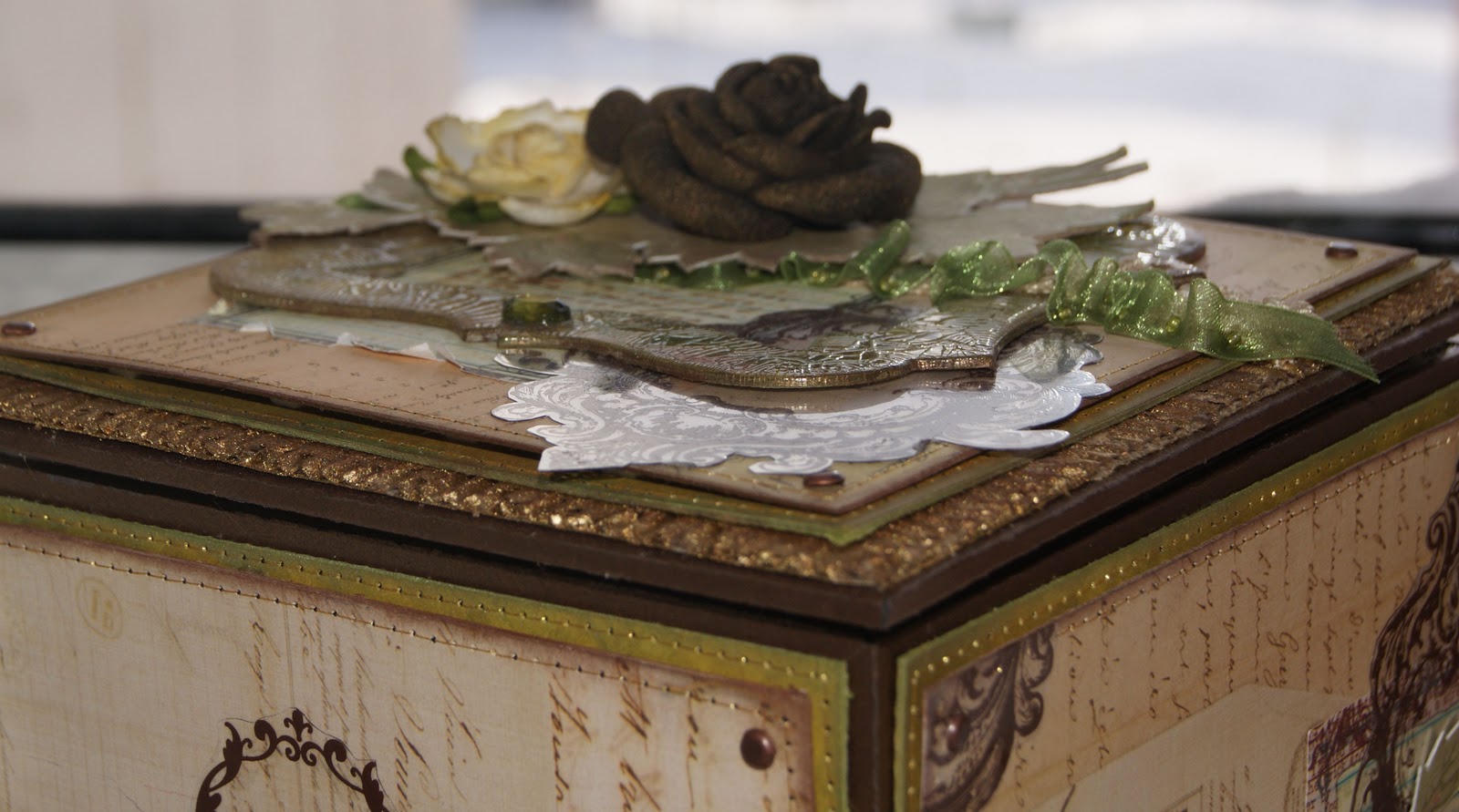 Остальная шкатулка сложилась к цветку. Сделана она с нуля из коробки из под пиццы (ими уже завален весь балкон, вот жадина я:))). Выдвижные ящички - из тонкого картона бронзового цвета, им же обклеены углы и края шкатулки. Затем все стороны задекорированы скрап бумагой, так же укрепленной картоном, и украшены. Это крышка: