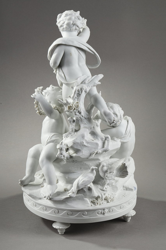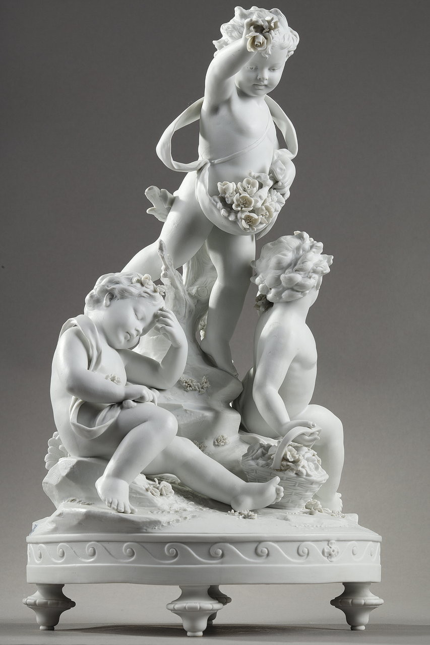 Фарфоровая группа в бисквите, изображающая трех маленьких детей, один из которых сидит и отдыхает на стволе дерева, а двое других играют с цветочными гирляндами.1890