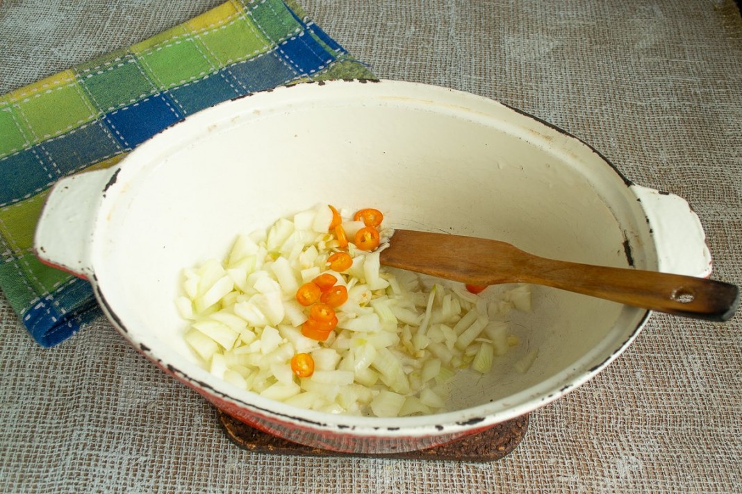 В растопленный жир кладём мелко порезанный репчатый лук, через полминуты добавляем измельченный чеснок и стручок перца чили, нарезанный колечками.