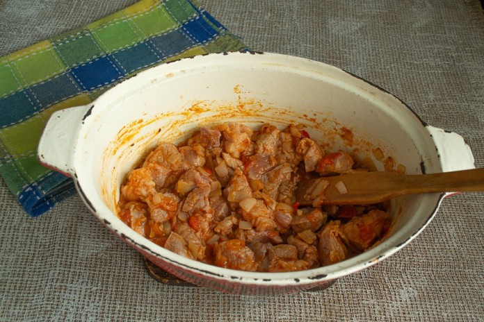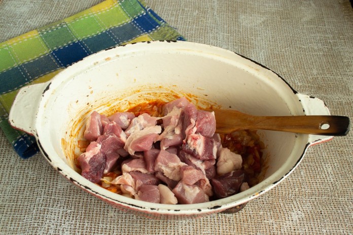 Нежирную свинину (лопатка, окорок) режем крупными кубиками, кладём в жаровню.