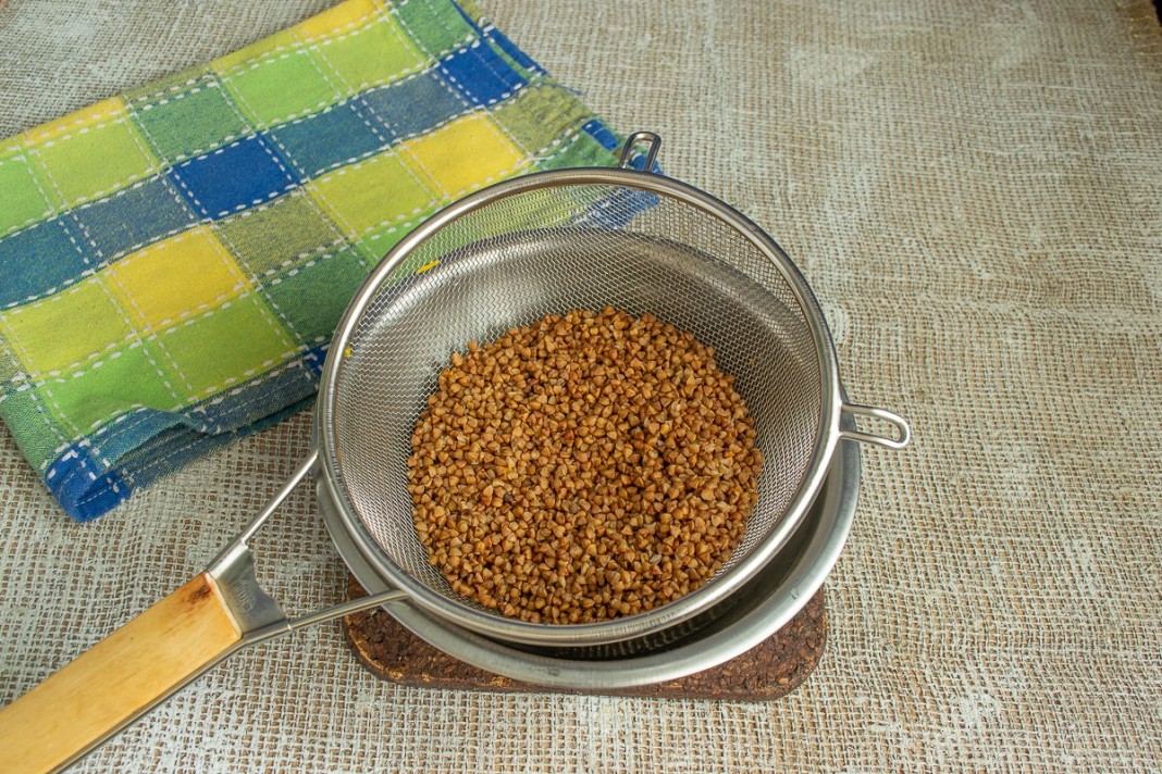 Тем временем перебираем гречневую крупу, замачиваем в холодной воде, тщательно промываем под краном. Оставляем в дуршлаге, чтобы стекла вода.