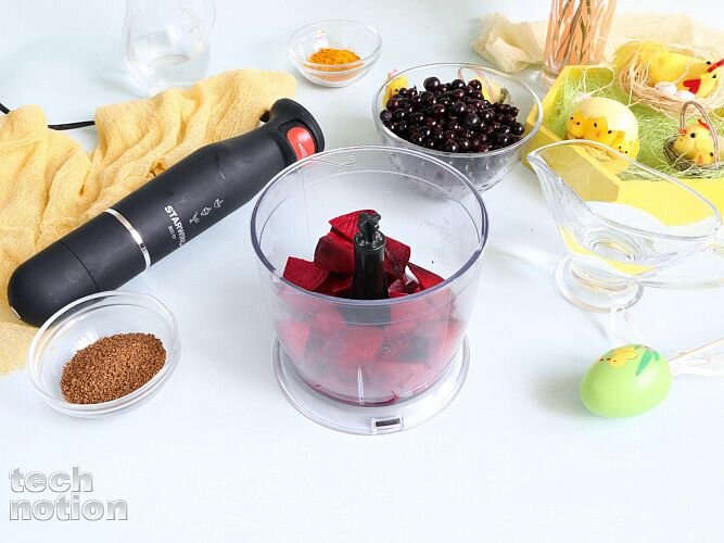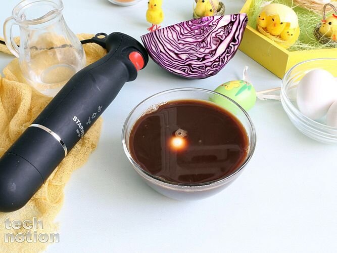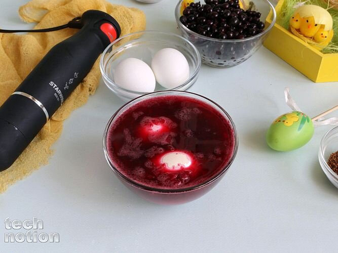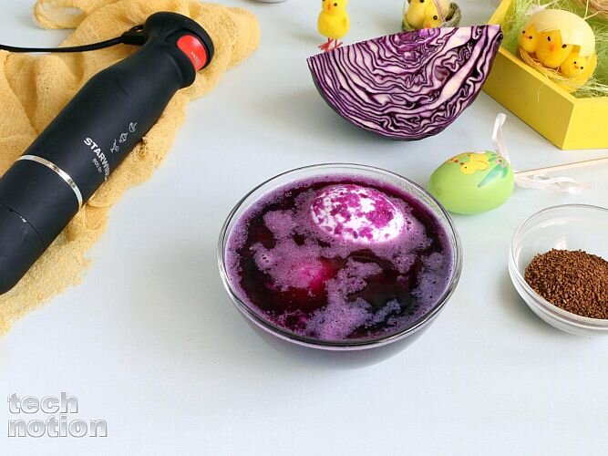 Порядок действий тут такой же: пюрировать ее, залить водой, отварить, добавить уксус и положить в краситель яйца