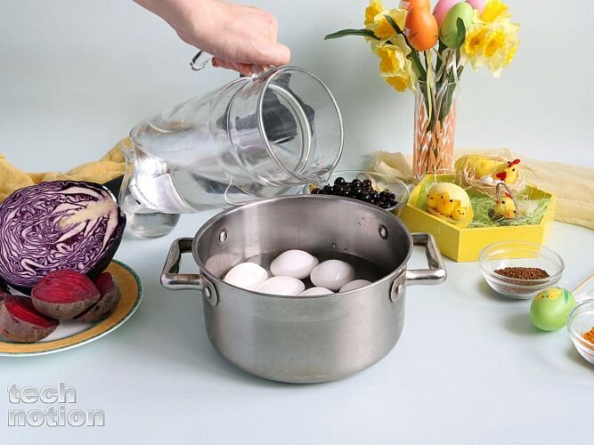 В красящий раствор лучше помещать горячие яйца, так цвет ляжет равномернее. Поэтому, пока яйца варятся, мы быстро подготовим наши натуральные красители.