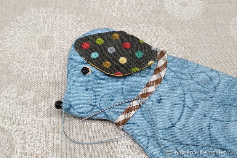 6. Ушки пришиваем потайным швом от точки 7 до точки 8 (выкройка). Хвостик полностью пришит потайным швом. Глазки состоят из кружка фетра и крупного черного бисера. На самом деле светлый кружок нужен, чтобы выделить глазик на темных тканях, на светлых можно и просто бисеринкой обойтись.