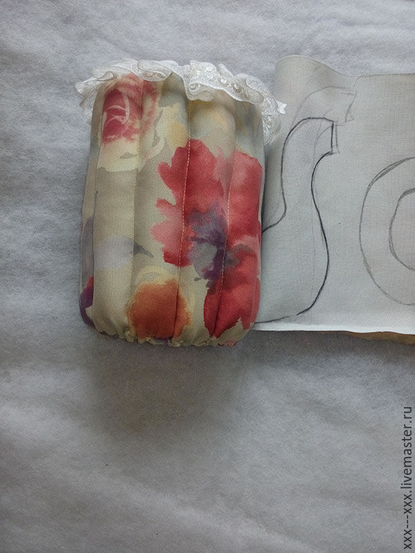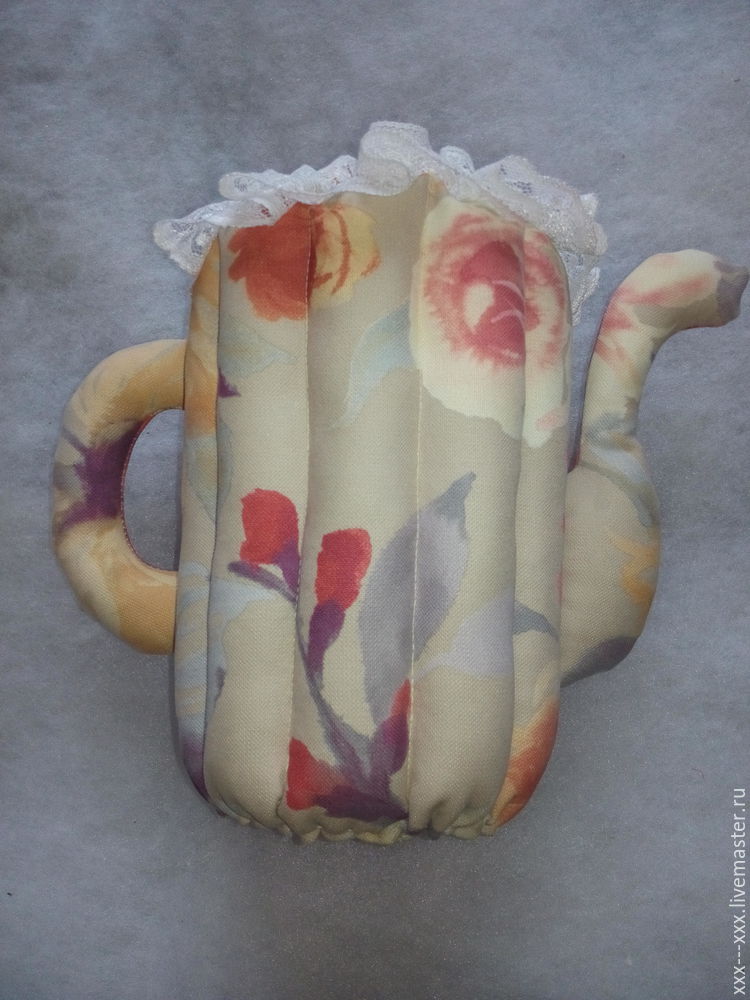 Чтобы подобрать самый подходящий вариант формы носика и ручки, я на изнаночной стороне кусочка ткани, предварительно сложив его вдвое, рисую карандашом эти детали. Затем подставляю уже готовую основу и смотрю на результаты: сочетается или нет. Носик чайника должен быть чуть меньше нашей основной формы, и ручка не должна быть слишком тонкой.