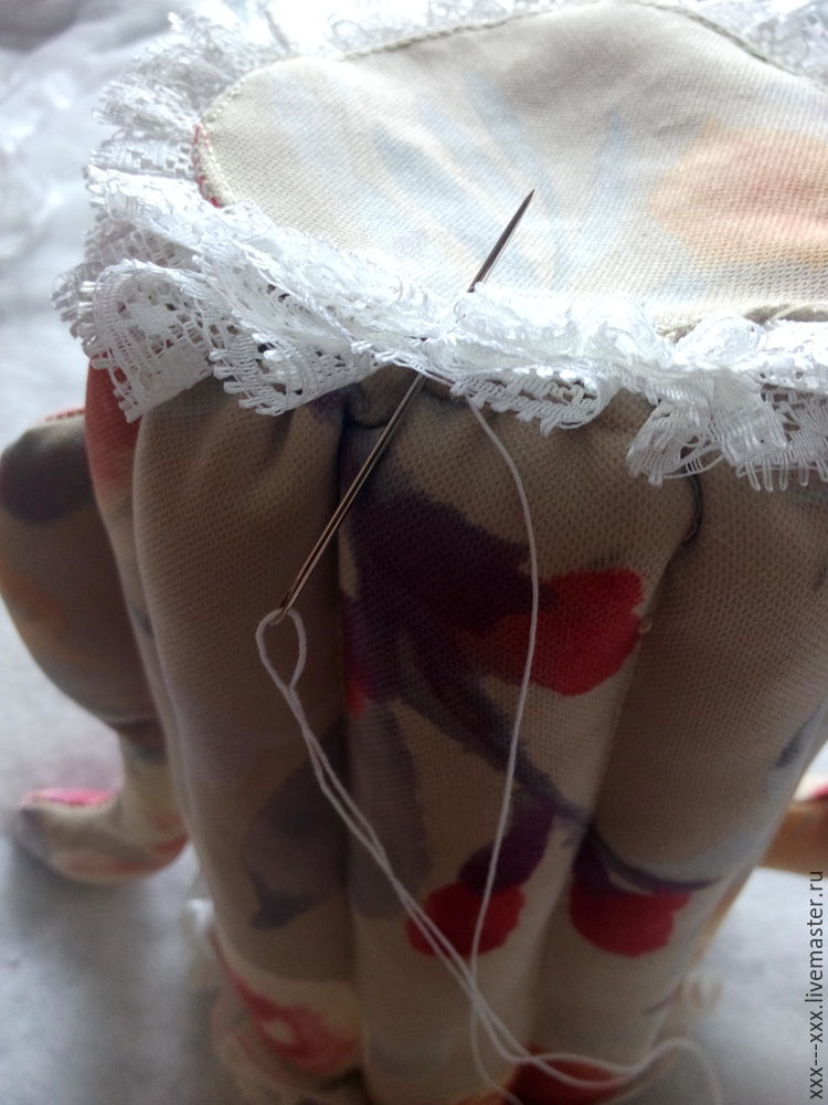 Я пришиваю тесьму складочками, чтобы подарить чайничку воздушность и скрыть стяжку нижней части чайника. Вот и готова ваза-чайник.