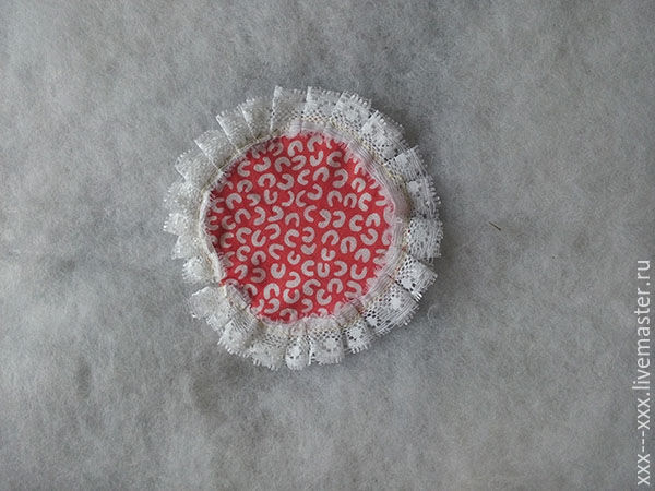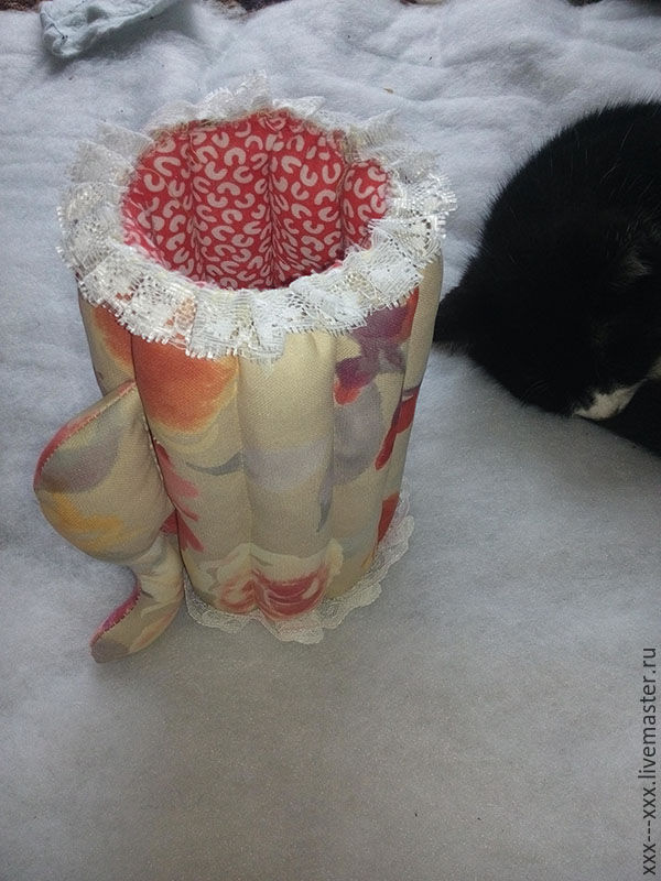 Теперь пришиваем тесьму к нижней основе нашего чайничка (ах, простите появление в кадре моего кота Василия — он большой поклонник моих рукоделочек :) и всегда очень внимательно следит за процессом).