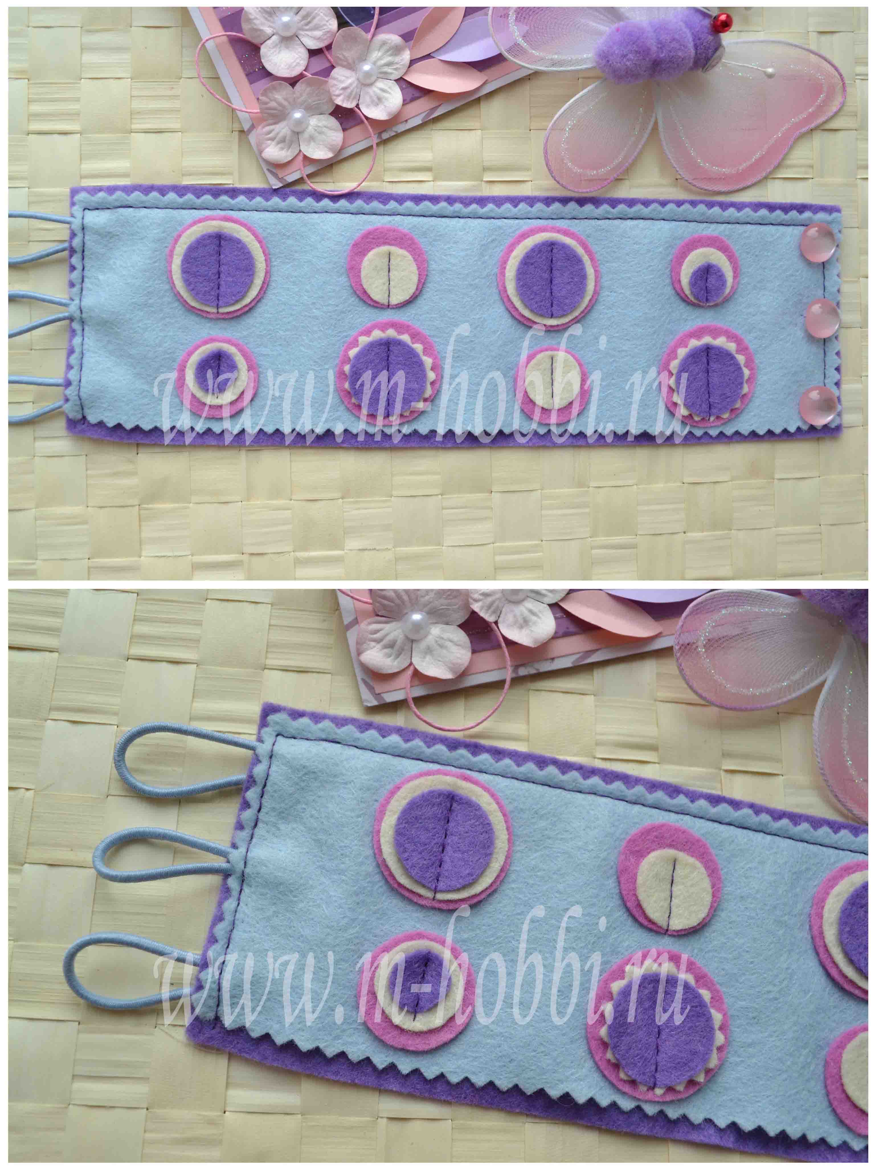 Для работы я использовала фетр четырех оттенков, нитки и швейную машинку. Еще понадобились шляпная резинка и пуговки. Вся работа у меня заняла около часа.