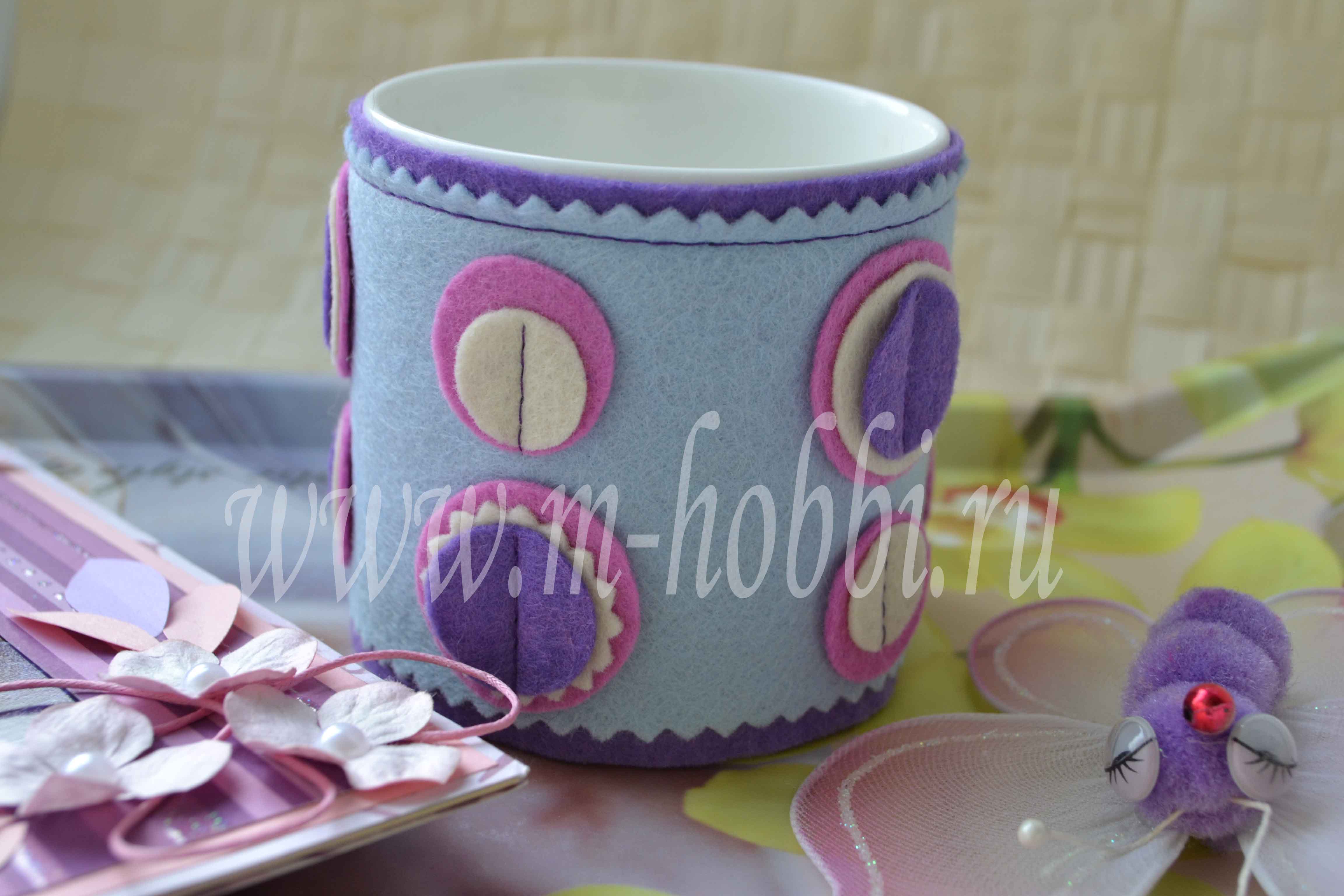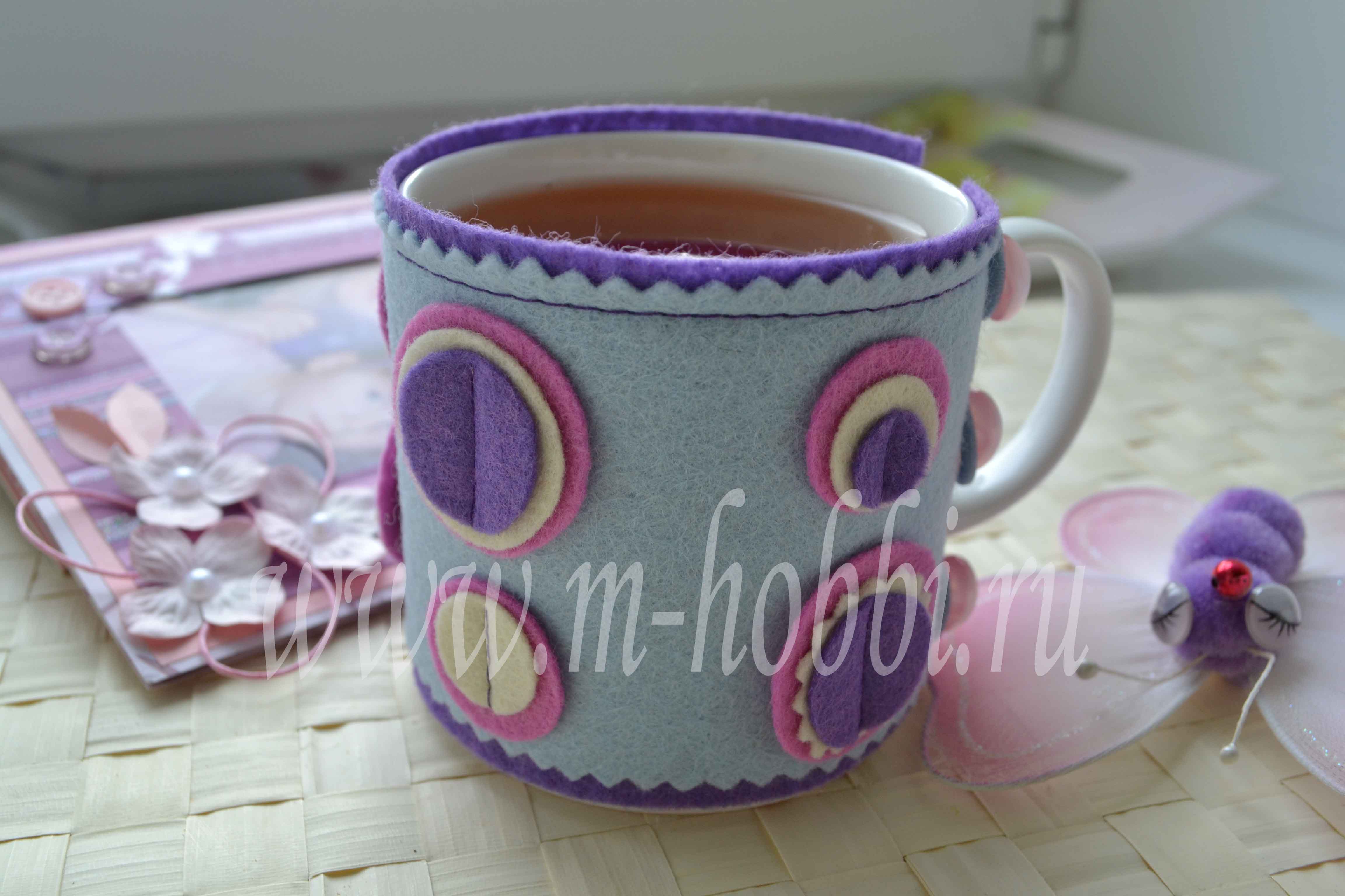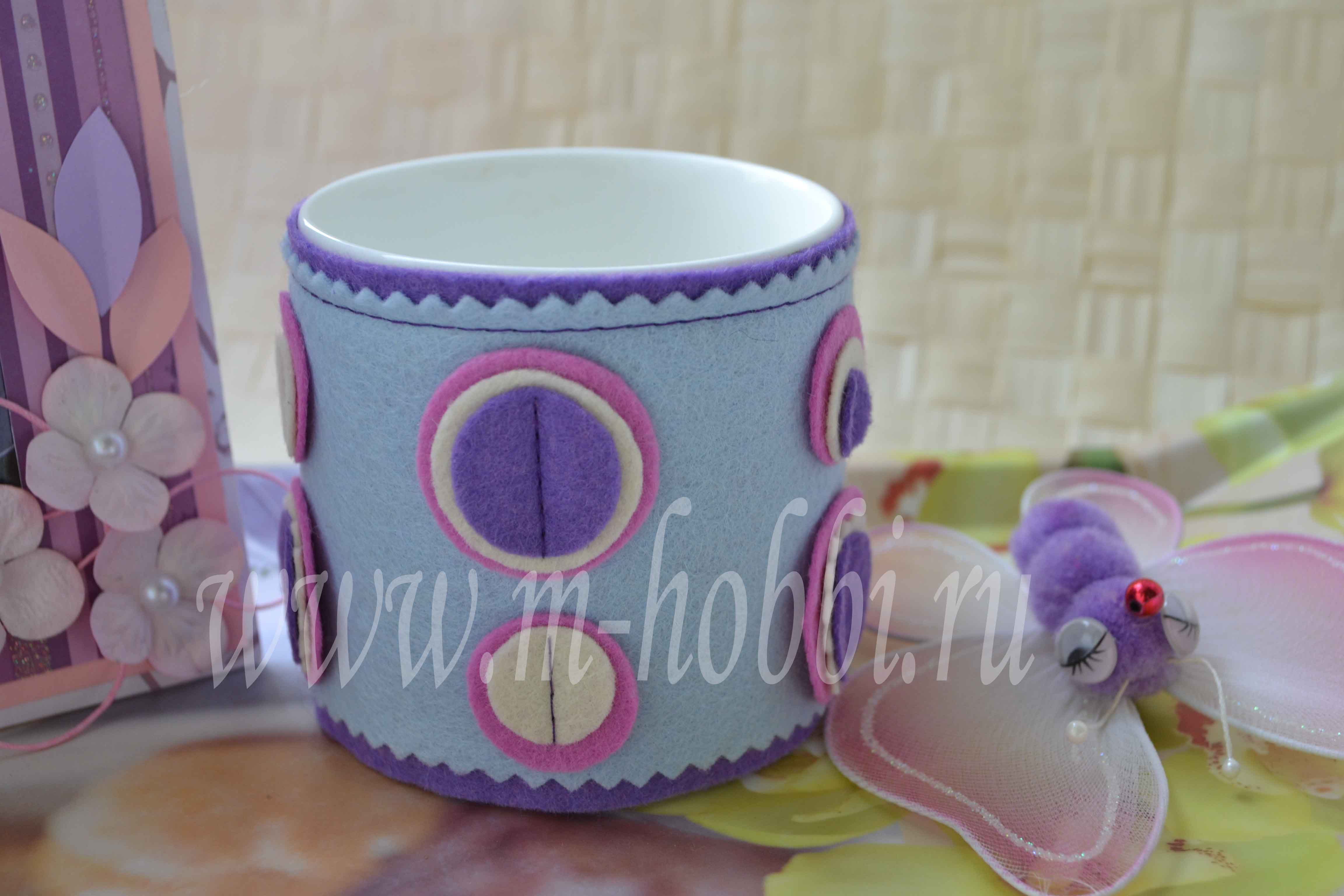 Чашечку эту подарили мне коллеги по работе и с первого взгляда она мне очень полюбилась. Но вот беда, на работе прохладно и чай в чашке быстро стынет. Поэтому я решила сшить для чашки такой фетровый подстаканник.