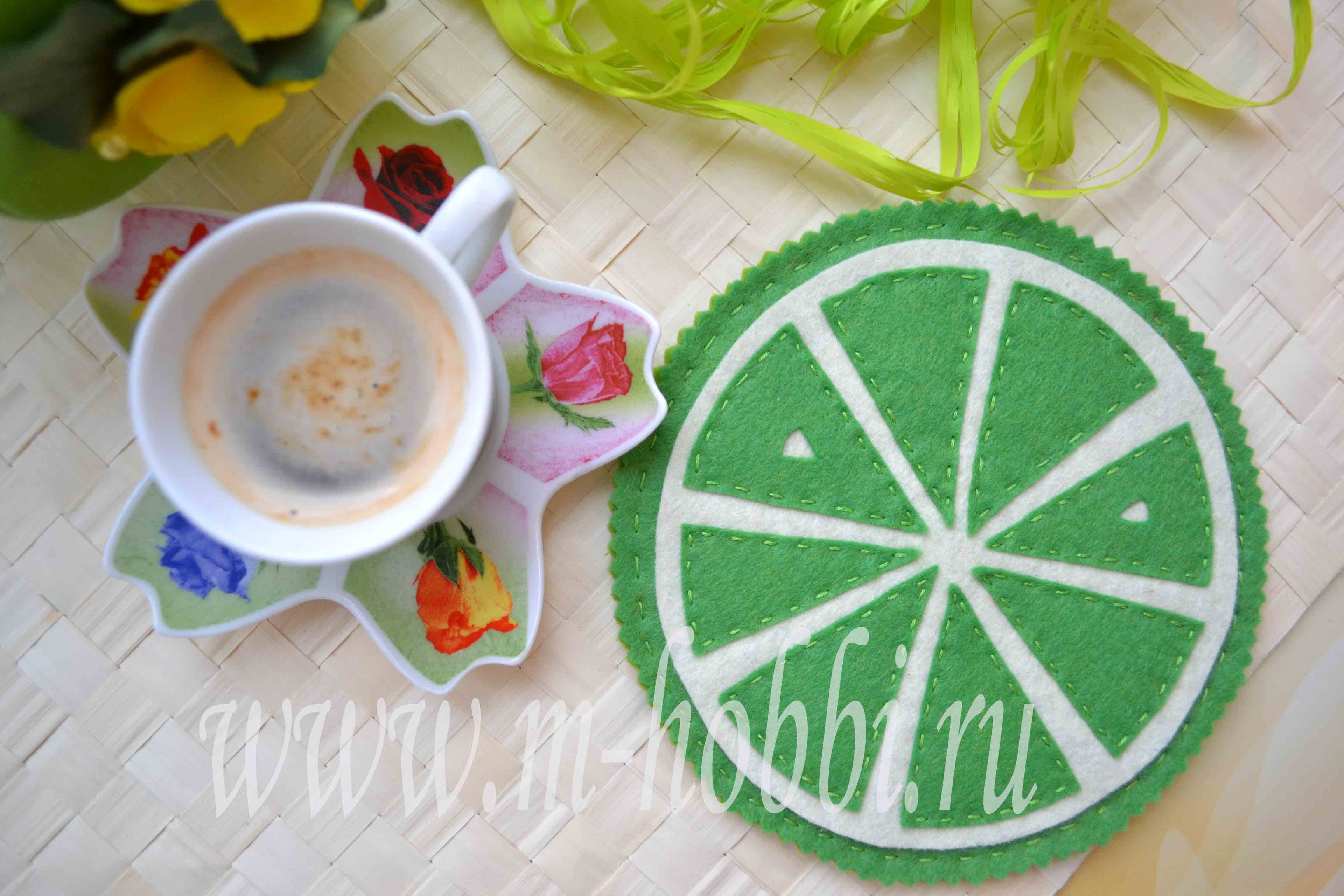 Я намеренно сшила их из яркого фетра, чтобы в пасмурную зимнюю погоду они напоминали о лете и о сочных тропических фруктах. Пока в моей коллекции две подставки: одна – рыжий апельсин, вторая – ярко-зеленый лайм.