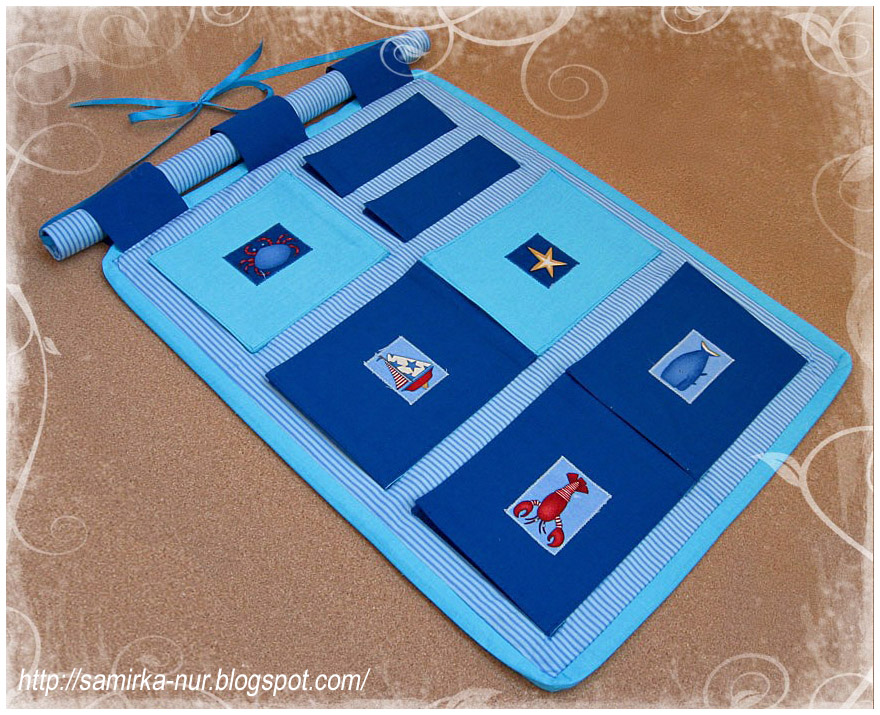 Заказали морские кармашки для девочки. C помощью ярко-бирюзового хлопка попыталась придать им более "девчачий" вид (хотя заказчица на этом и не настаивала). Не знаю получилось ли. Что скажете? Всё-таки морская тема, наверное, больше для мальчишек.