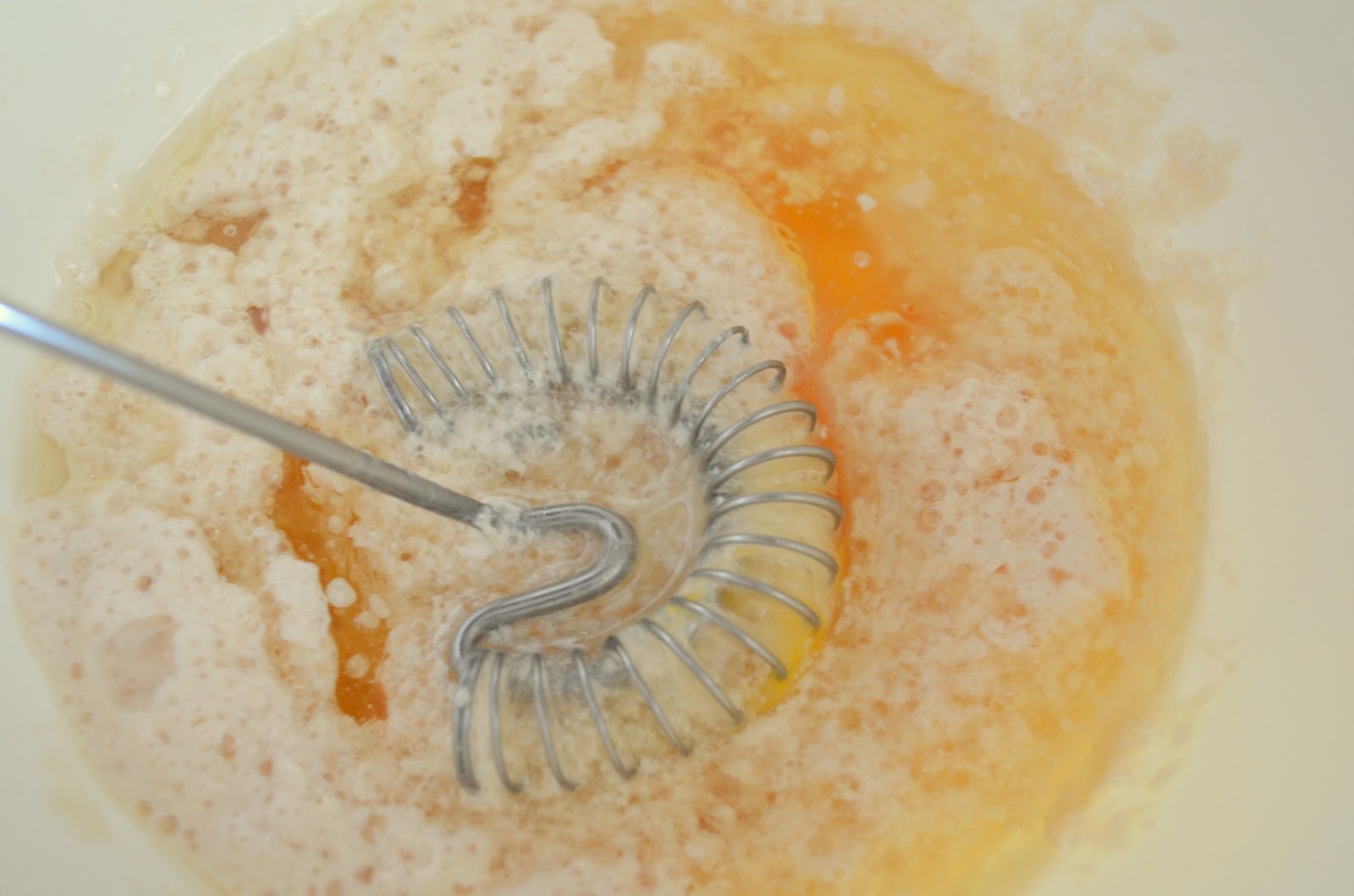 когда на поверхности появится пена, добавить туда 2 яйца и мягкое сливочное масло и размешать венчиком.