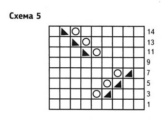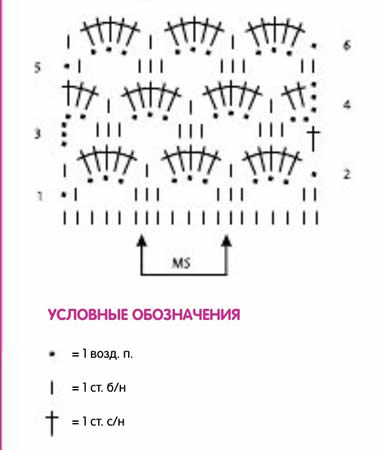 Узор «ракушки»: число петель кратно 6 + 1 п. Вязать по схеме. Начинать с петель перед раппортом, повторять петли раппорта, заканчивать петлями после раппорта. Связать с 1-го по 6-й р., повторять 3-й - 6-й р.
