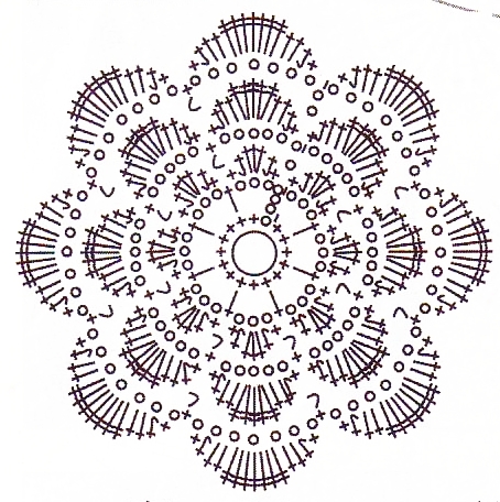 Схема цветочка с восемью лепестками, но его легко можно заменить семь, шесть и даже на пять, уменьшив в первых двух рядах количество столбиков без накида и столбиков с накидами до нужного вам количества лепестков.