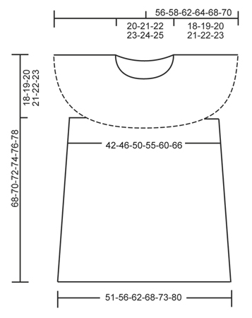 Набрать 216-236-260-284-308-336 п. на круговые спицы 3 мм. Связать 2 рубчика платочной вязкой. Перейти на спицы 4 мм. и вязать лицевой гладью. ЗАПОМНИТЬ ПЛОТНОСТЬ ВЯЗАНИЯ! Когда длина изделия составит 6-7-8-8-8-8 см., установить 1 метку в начало ряда и еще 1 после 108-118-130-142-154-168 п. (= метки по бокам). Теперь начать убавлениения по бокам по 1 п. с каждой стороны от метки — СМ. ИНСТРУКЦИЮ ПО УБАВЛЕНИЮ (= на 4 п. меньше). Повторить убавления через каждые 4½-4-3½-3½-3-3 см. еще 9-10-11-12-13-14 раз = 176-192-212-232-252-276 п. Когда длина изделия составит ~ 49-50-51-52-53-54 см., связать 2 рубчика платочной вязкой по средним 14 п. каждого бока (т.е. по 7 п. с каждой стороны метки), а остальные п. продолжить вязать лицевой гладью. В следующем ряду закрыть по 10 п. с каждого бока для пройм (т.е. по 5 п. с каждой стороны метки) = 78-86-96-106-116-128 п. на спинку и перед. Отложить изделие и связать рукава.