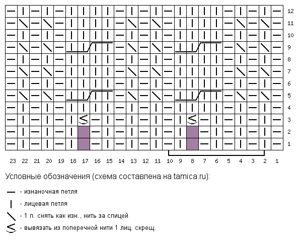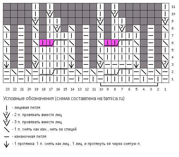 Начать вязание по схеме 1, повторить ряды 1 и 2 пять раз, связав таким образом 10 рядов резинкой 1х1. 3 ряд схемы: перейти на спицы 5,5, выполнить прибавки. В конце ряда на спицах 81 петля. Далее вязать по схеме 1, повторяя с 5 по 8 ряды, пока высота шапки с начала вязания не составит 17 см. Закончить вязание рядом номер 7. И перейти к вязанию по схеме 2. Связать схему 2 с 1 по 11 ряды, стянуть оставшиеся петли рабочей нитью, протянув ее через петли. Закрепить нить на изнаночной стороне работы иглой для трикотажа или крючком. Также закрепить нить, оставшуюся от набора петель, на изнаночной стороне работы. Выполнить ВТО готовой шапки. Дать высохнуть. Шапка готова, можно носить! После стирки и особенно полоскания в смягчающем средстве (я использую кондиционер для волос) шапка становится значительно мягче и приятнее к телу. СХЕМА 1 |
