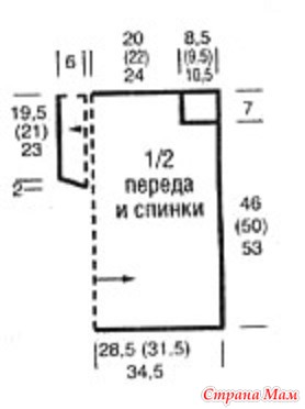 Для переда набрать 84 п. + 2 кром. и вязать в указанной выше последовательности. Через 24 см = 50 р. от наборного края закрыть для выреза горловины с левой стороны 10 п. Через 34,5 см от начала вязания достигнута середина, отсюда закончить симметрично. Убавления станут прибавлениями.