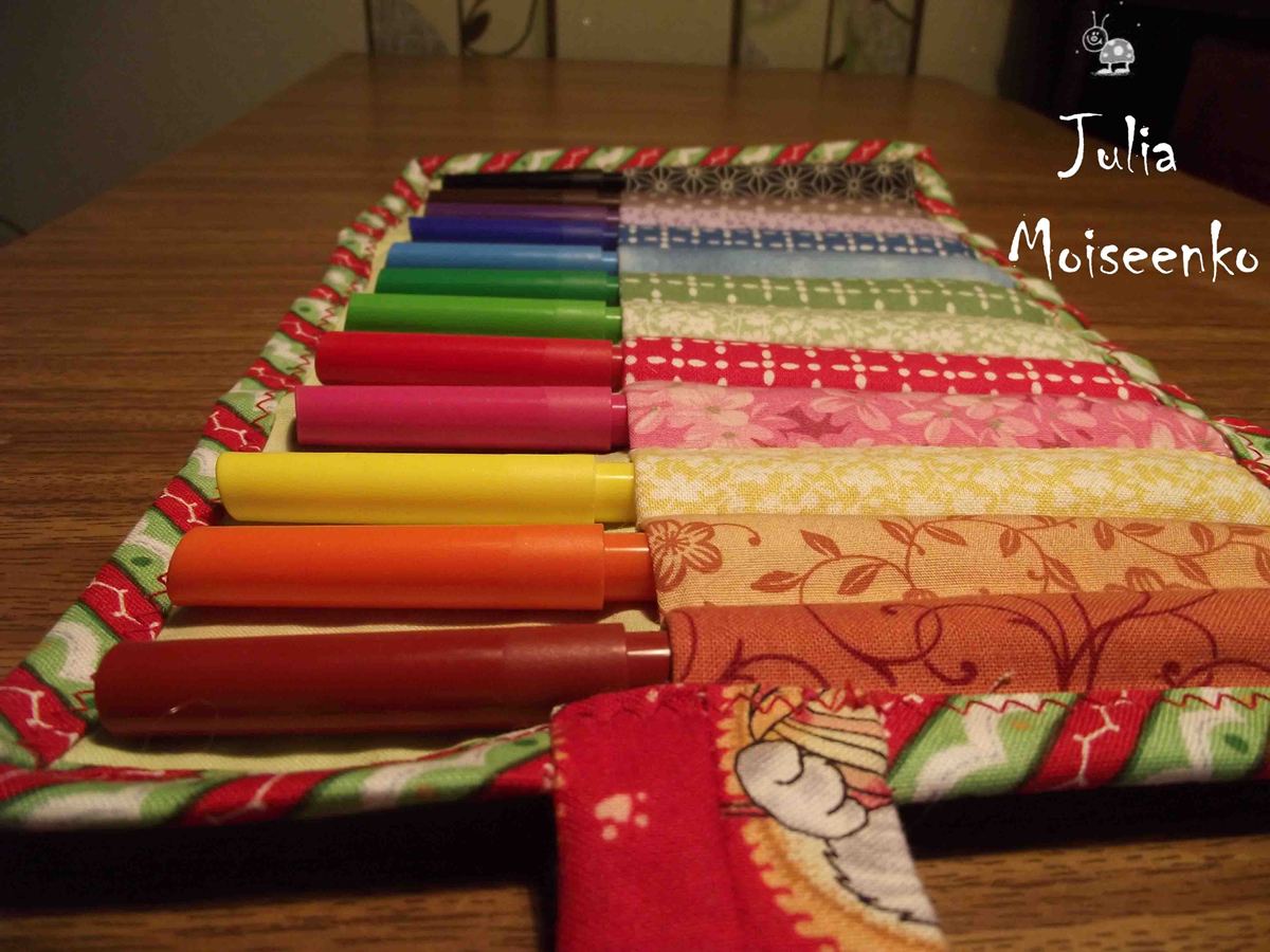 С текстильными куклами у меня пока перерыв, но без шитья уже не могу :) Поэтому вот - сшила дочке пенал для фломастеров, с разными кармашками под каждый цвет. Двойная польза: и фломастеры на своём месте, и ребенку развивайка :)
